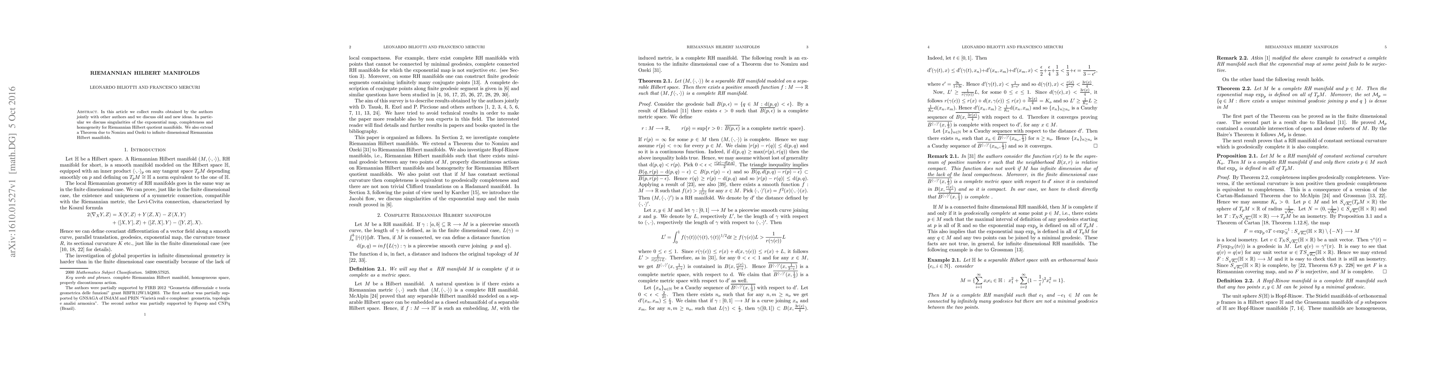In this article we collect results obtained by the authors jointly with other authors and we discuss old and new ideas. In particular we discuss singularities of the exponential map, completeness and homogeneity for Riemannian Hilbert quotient manifolds. We also extend a Theorem due to Nomizu and Ozeki to infinite dimensional Riemannian Hilbert manifolds.