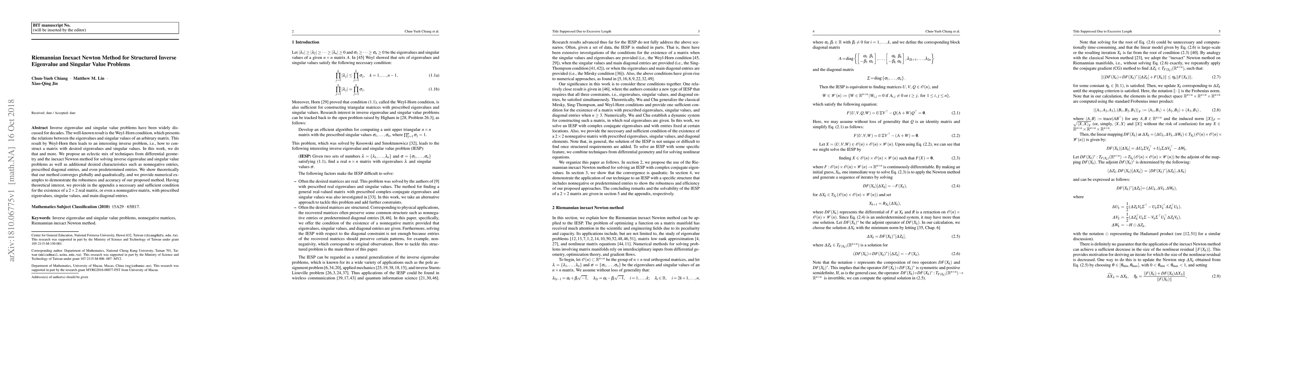 This paper proposes a Riemannian inexact Newton method combining differential geometry with inexact Newton techniques to solve inverse eigenvalue and singular value problems, including constraints like nonnegative entries and prescribed diagonals. The method is shown to converge globally and quadratically, with numerical examples demonstrating its robustness and accuracy.