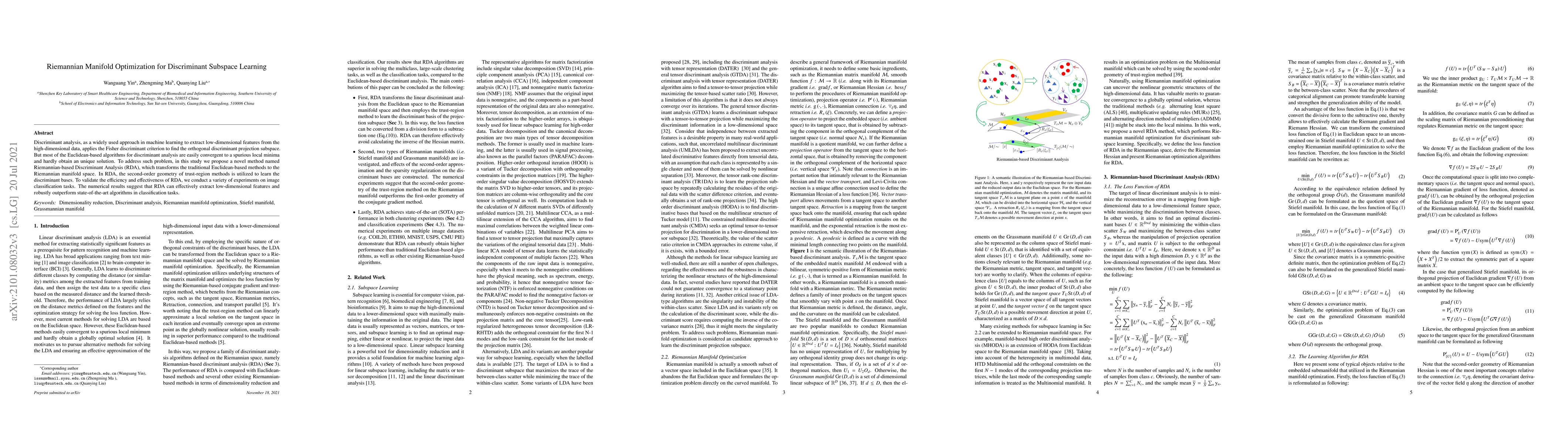 Linear discriminant analysis (LDA) is a widely used algorithm in machine learning to extract a low-dimensional representation of high-dimensional data, it features to find the orthogonal discriminant projection subspace by using the Fisher discriminant criterion. However, the traditional Euclidean-based methods for solving LDA are easily convergent to spurious local minima and hardly obtain an optimal solution. To address such a problem, in this paper, we propose a novel algorithm namely Riemannian-based discriminant analysis (RDA) for subspace learning. In order to obtain an explicit solution, we transform the traditional Euclidean-based methods to the Riemannian manifold space and use the trust-region method to learn the discriminant projection subspace. We compare the proposed algorithm to existing variants of LDA, as well as the unsupervised tensor decomposition methods on image classification tasks. The numerical results suggest that RDA achieves state-of-the-art performance in classification accuracy.