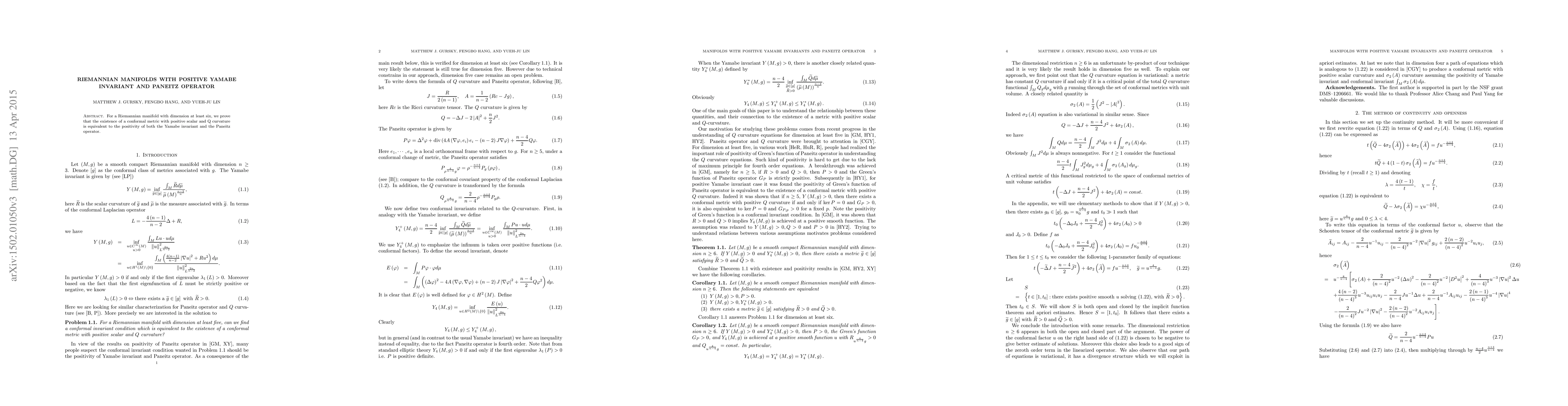 This paper proves that for a Riemannian manifold with dimension six or higher, the existence of a conformal metric with positive scalar and Q curvature is equivalent to the positivity of both the Yamabe invariant and the Paneitz operator. This establishes a connection between geometric invariants and conformal geometry.