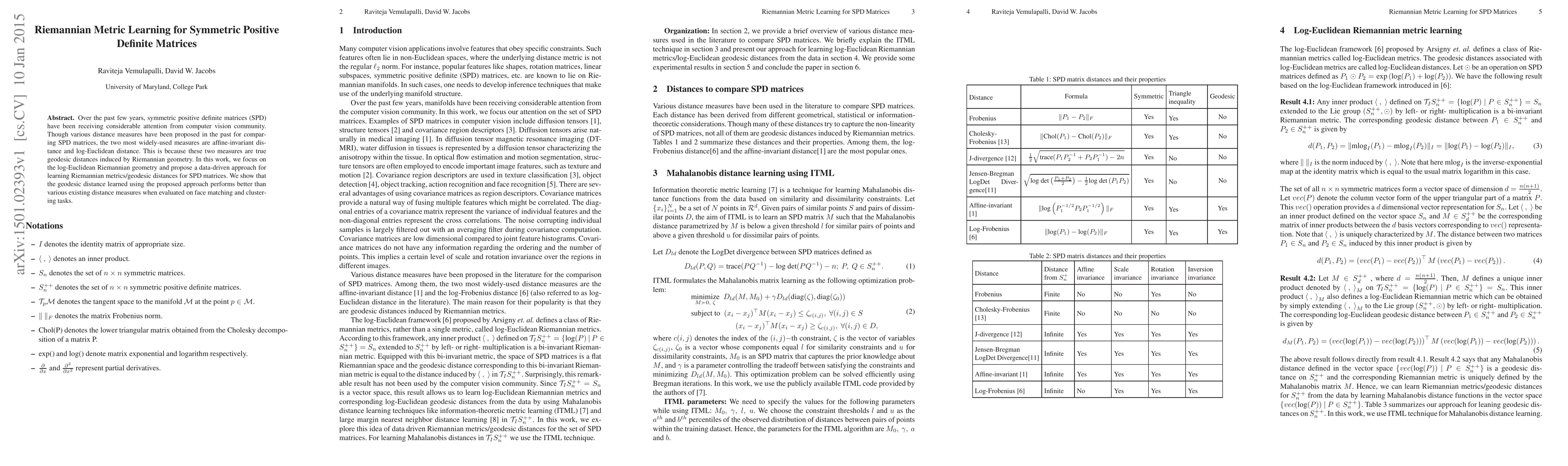 This paper proposes a data-driven method for learning Riemannian metrics for symmetric positive definite matrices, focusing on log-Euclidean geometry. The learned geodesic distances outperform existing measures in face matching and clustering tasks.