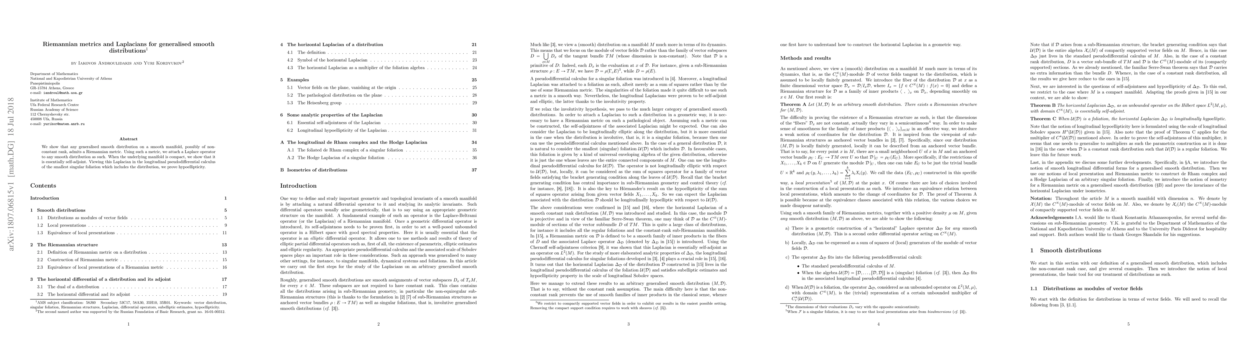 We show that any generalised smooth distribution on a smooth manifold, possibly of non-constant rank, admits a Riemannian metric. Using such a metric, we attach a Laplace operator to any smooth distribution as such. When the underlying manifold is compact, we show that it is essentially self-adjoint. Viewing this Laplacian in the longitudinal pseudodifferential calculus of the smallest singular foliation which includes the distribution, we prove hypoellipticity.