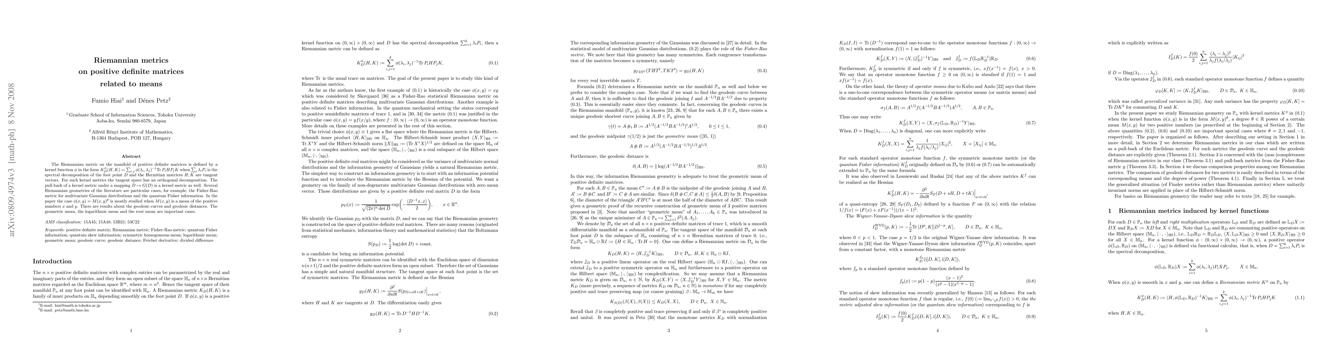 This paper explores Riemannian metrics on the manifold of positive definite matrices defined by kernel functions, particularly focusing on metrics derived from means of positive numbers. It studies geodesic curves and distances under these metrics, highlighting the geometric, logarithmic, and root means as significant cases.