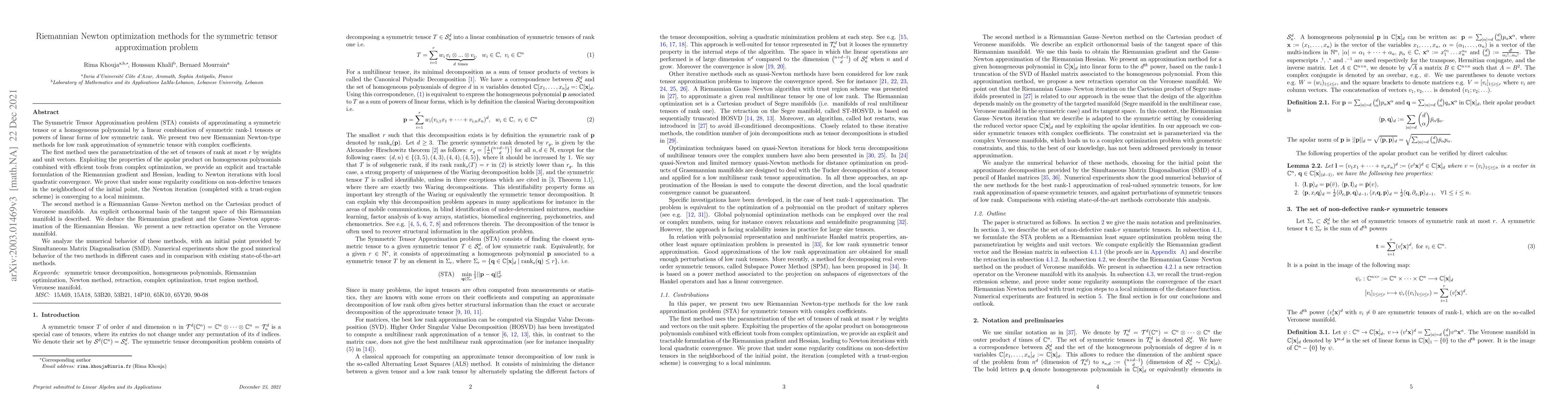 The Symmetric Tensor Approximation problem (STA) consists of approximating a symmetric tensor or a homogeneous polynomial by a linear combination of symmetric rank-1 tensors or powers of linear forms of low symmetric rank. We present two new Riemannian Newton-type methods for low rank approximation of symmetric tensor with complex coefficients.The first method uses the parametrization of the set of tensors of rank at most $r$ by weights and unit vectors.Exploiting the properties of the apolar product on homogeneous polynomials combined with efficient tools from complex optimization, we provide an explicit and tractable formulation of the Riemannian gradient and Hessian, leading to Newton iterations with local quadratic convergence. We prove that under some regularity conditions on non-defective tensors in the neighborhood of the initial point, the Newton iteration (completed with a trust-region scheme) is converging to a local minimum.The second method is a Riemannian Gauss--Newton method on the Cartesian product of Veronese manifolds. An explicit orthonormal basis of the tangent space of this Riemannian manifold is described. We deduce the Riemannian gradient and the Gauss--Newton approximation of the Riemannian Hessian. We present a new retraction operator on the Veronese manifold.We analyze the numerical behavior of these methods, with an initial point provided by Simultaneous Matrix Diagonalisation (SMD).Numerical experiments show the good numerical behavior of the two methods in different cases and in comparison with existing state-of-the-art methods.