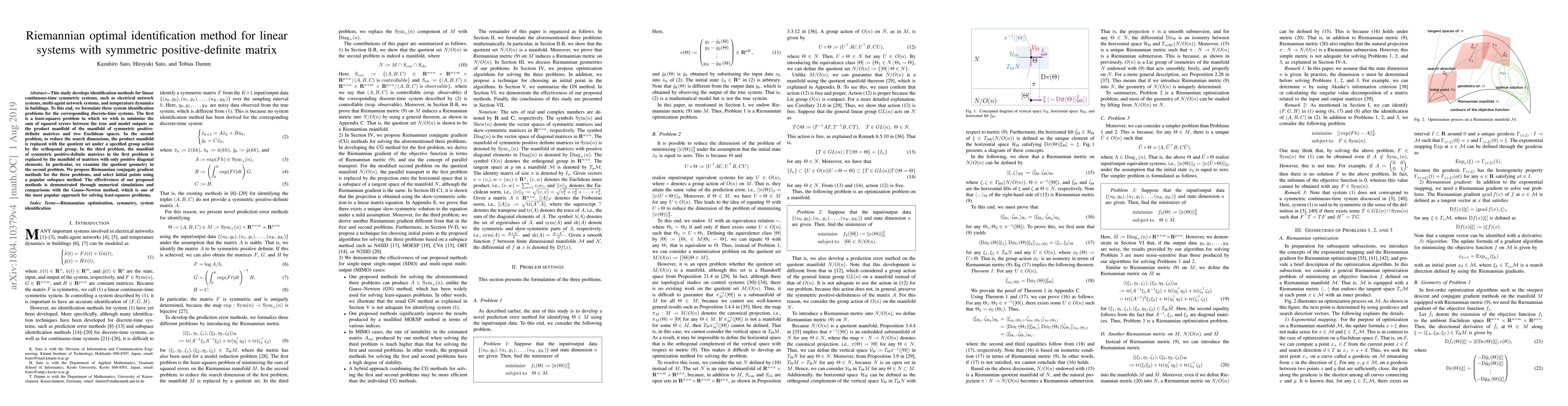 This paper proposes Riemannian optimal identification methods for linear continuous-time systems using symmetric positive-definite matrices, addressing three distinct least-squares problems on various manifolds. The effectiveness of these methods is validated through numerical simulations and comparisons with the Gauss-Newton method.