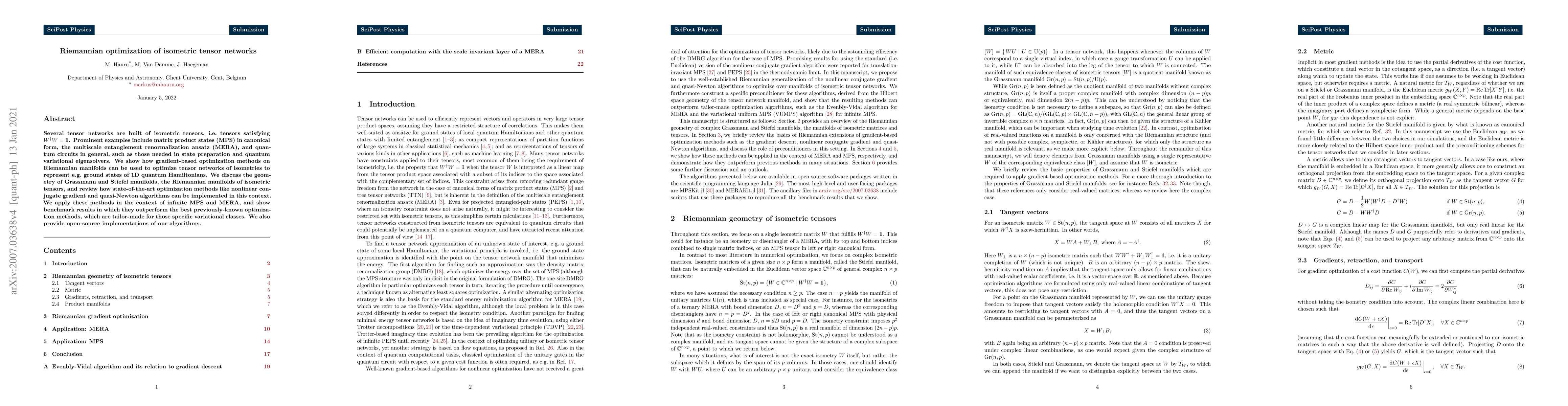 This paper explores the application of Riemannian optimization techniques to tensor networks composed of isometric tensors, demonstrating improved optimization for representing ground states of 1D quantum Hamiltonians. The authors utilize Riemannian manifolds, specifically Grassmann and Stiefel manifolds, and implement advanced optimization algorithms to achieve superior performance over existing methods.