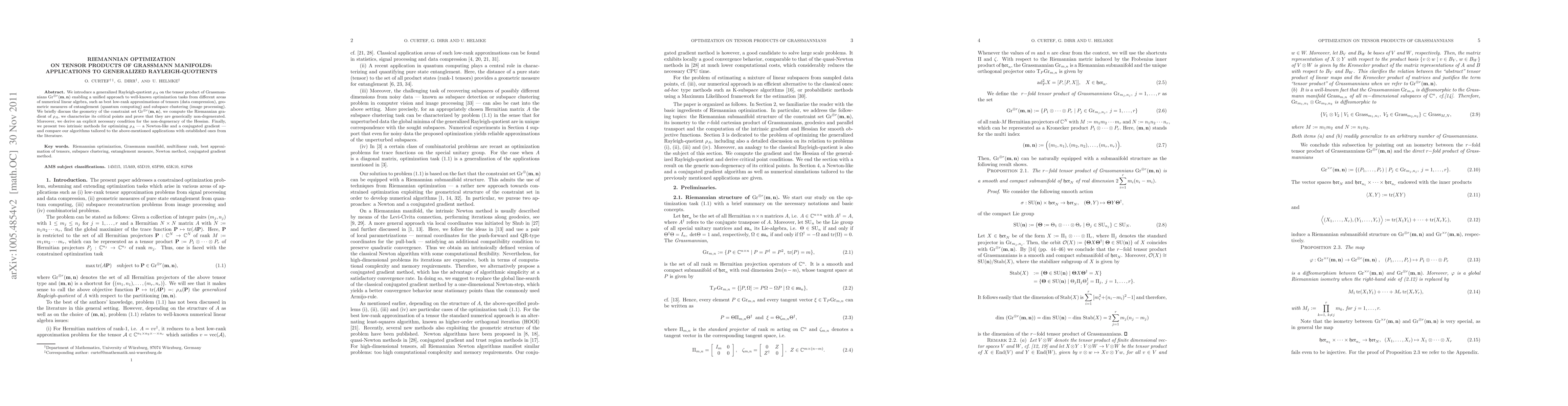 This paper introduces a generalized Rayleigh-quotient on tensor products of Grassmannians, enabling unified optimization for tasks like tensor compression, entanglement measures, and subspace clustering. It discusses the geometry, computes Riemannian gradients, and characterizes critical points, proving their non-degeneracy, and presents two intrinsic optimization methods for these applications.