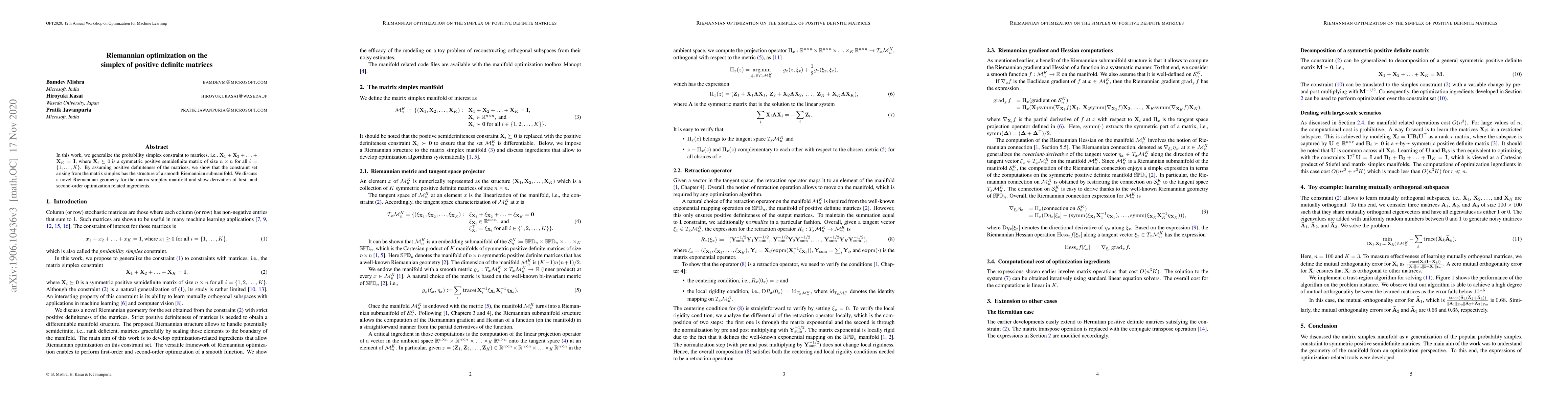 This paper generalizes the probability simplex constraint to positive definite matrices, demonstrating that the resulting matrix simplex forms a smooth Riemannian submanifold. The authors develop a novel Riemannian geometry for this manifold and derive first- and second-order optimization tools.