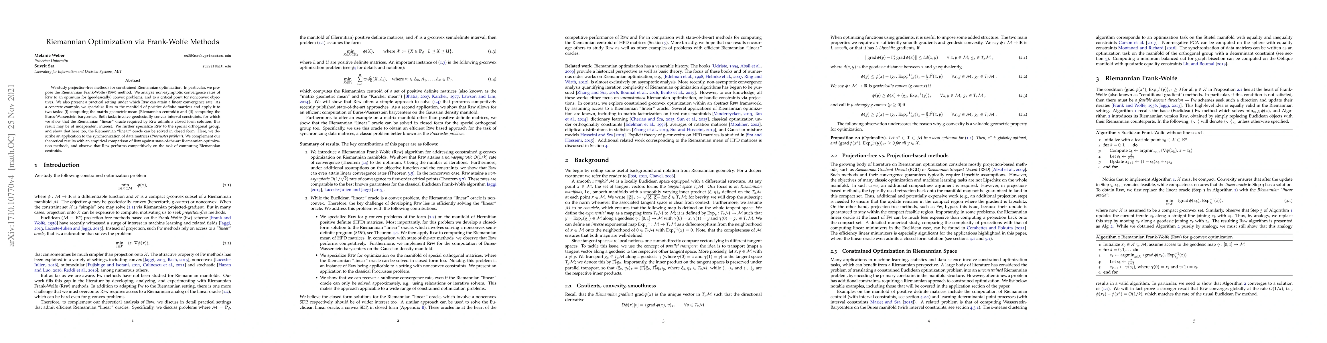 This paper proposes the Riemannian Frank-Wolfe (RFW) method for projection-free constrained Riemannian optimization, analyzing its convergence rates for convex and nonconvex problems. It demonstrates linear convergence under specific conditions and applies RFW to compute matrix geometric mean and Bures-Wasserstein barycenter on positive definite matrices and the Procrustes problem on the special orthogonal group, showing competitive empirical performance.