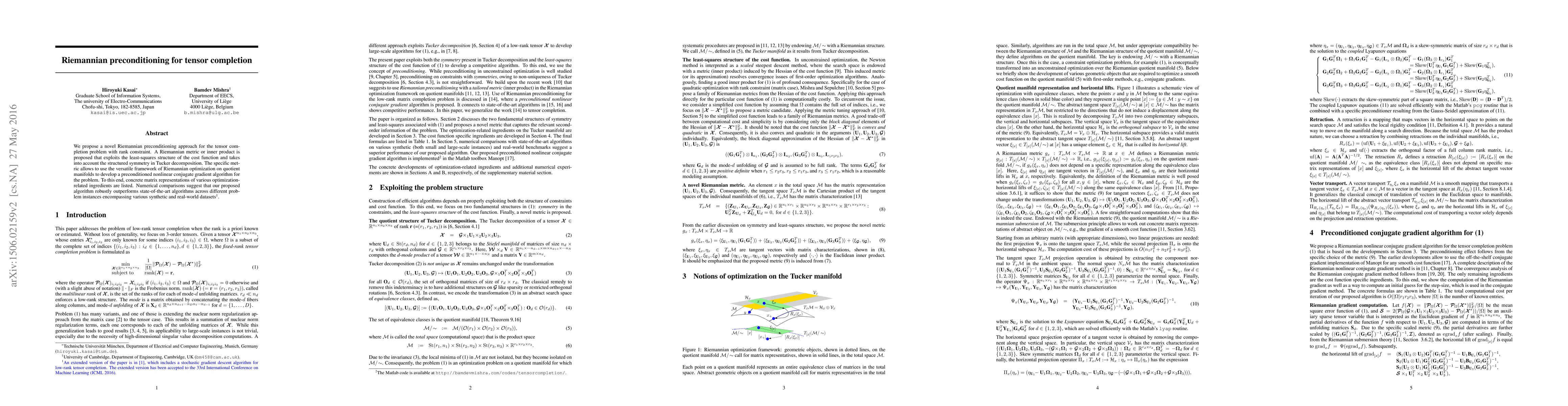 This paper introduces a Riemannian preconditioning method for tensor completion with rank constraints, leveraging a specialized Riemannian metric that enhances the least-squares cost function. The proposed algorithm, based on Riemannian optimization, outperforms existing methods in numerical comparisons across diverse datasets.