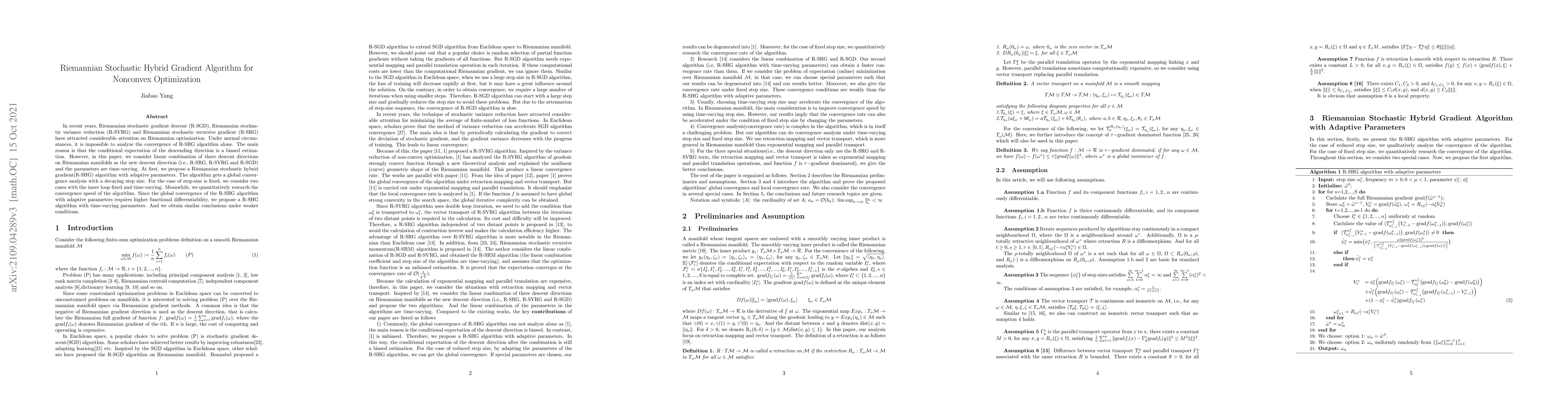 This paper proposes a Riemannian stochastic hybrid gradient (R-SHG) algorithm for nonconvex optimization on Riemannian manifolds, combining R-SRG, R-SVRG, and R-SGD methods. The algorithm achieves global convergence with adaptive parameters and a decaying step size, and a variant with time-varying parameters is also presented under weaker conditions.