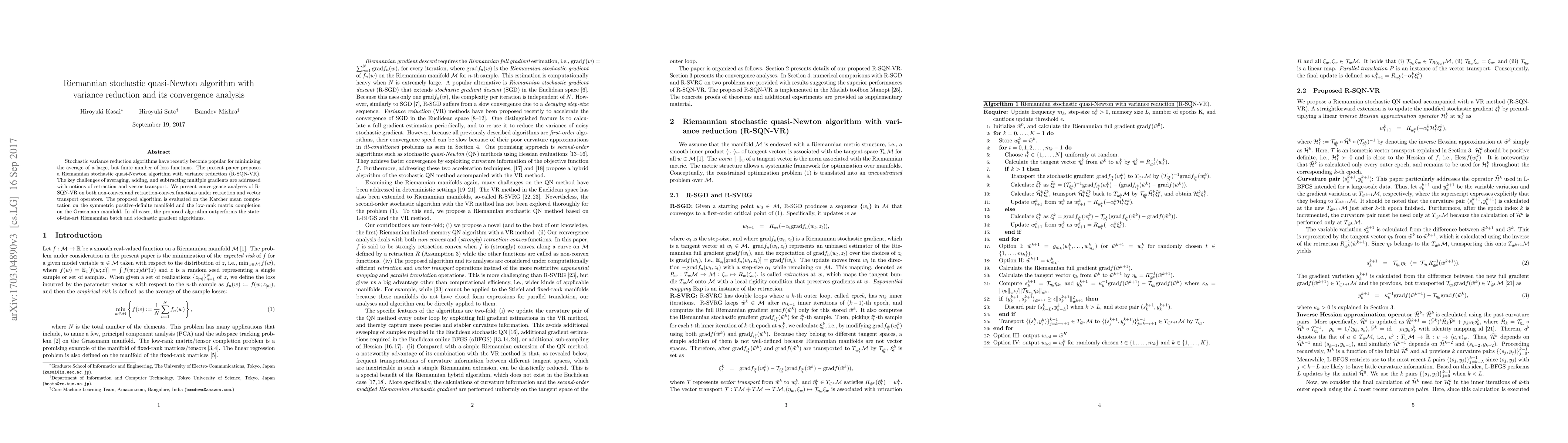 This paper introduces a Riemannian stochastic quasi-Newton algorithm with variance reduction (R-SQN-VR) for minimizing large loss functions. The algorithm addresses gradient averaging and subtraction using retraction and vector transport, and is shown to outperform existing methods in non-convex and retraction-convex function optimization on symmetric positive-definite and Grassmann manifolds.