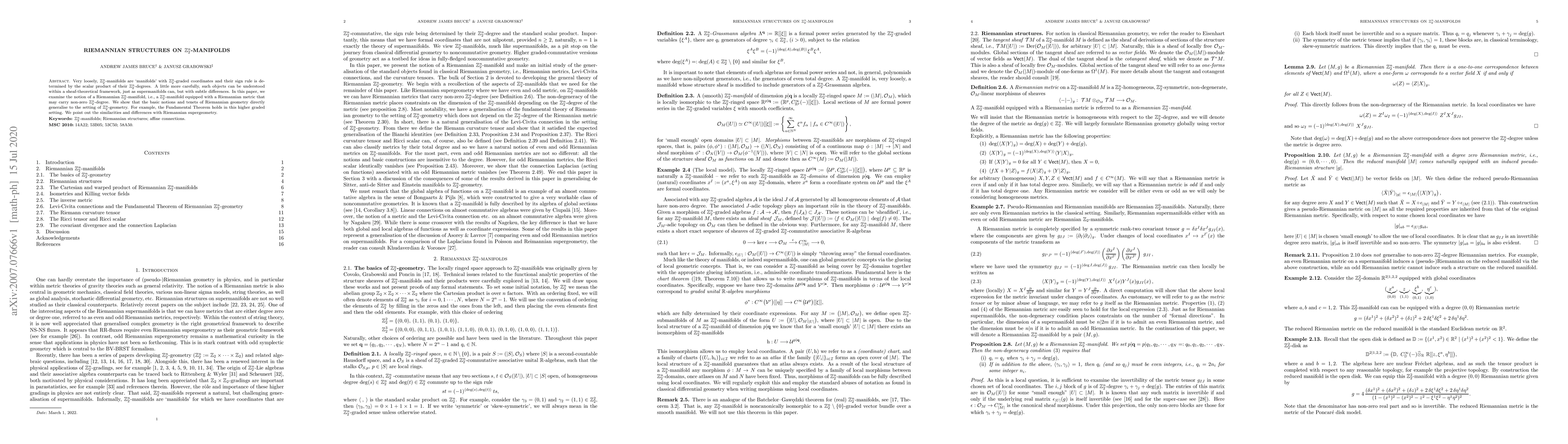 Very loosely, $\mathbb{Z}_2^n$-manifolds are `manifolds' with $\mathbb{Z}_2^n$-graded coordinates and their sign rule is determined by the scalar product of their $\mathbb{Z}_2^n$-degrees. A little more carefully, such objects can be understood within a sheaf-theoretical framework, just as supermanifolds can, but with subtle differences. In this paper, we examine the notion of a Riemannian $\mathbb{Z}_2^n$-manifold, i.e., a $\mathbb{Z}_2^n$-manifold equipped with a Riemannian metric that may carry non-zero $\mathbb{Z}_2^n$-degree. We show that the basic notions and tenets of Riemannian geometry directly generalise to the setting of $\mathbb{Z}_2^n$-geometry. For example, the Fundamental Theorem holds in this higher graded setting. We point out the similarities and differences with Riemannian supergeometry.