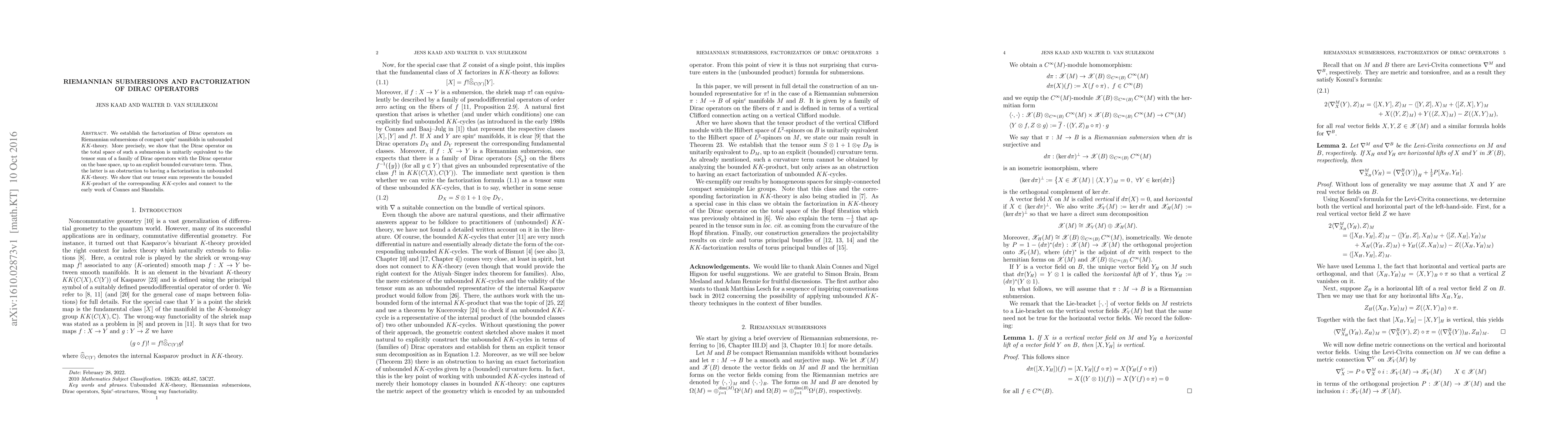 The paper demonstrates the factorization of Dirac operators on Riemannian submersions of compact spin$^c$ manifolds in unbounded KK-theory, showing that it is unitarily equivalent to a tensor sum of Dirac operators on the base space, with a bounded curvature term acting as an obstruction. This tensor sum corresponds to the bounded KK-product of KK-cycles, linking to Connes and Skandalis's foundational work.