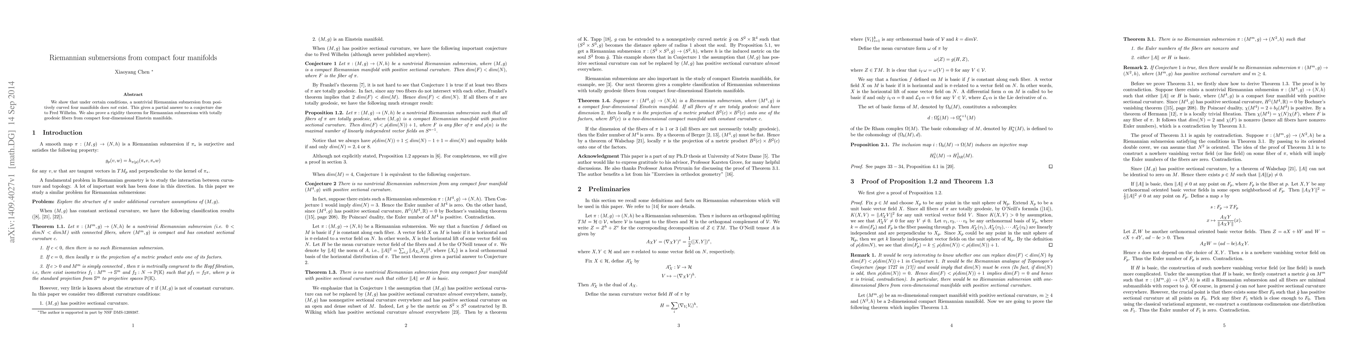 Summary: The paper demonstrates that nontrivial Riemannian submersions from positively curved four-manifolds do not exist under specific conditions, addressing a conjecture by Fred Wilhelm. Additionally, it establishes a rigidity theorem for submersions with totally geodesic fibers from compact four-dimensional Einstein manifolds.