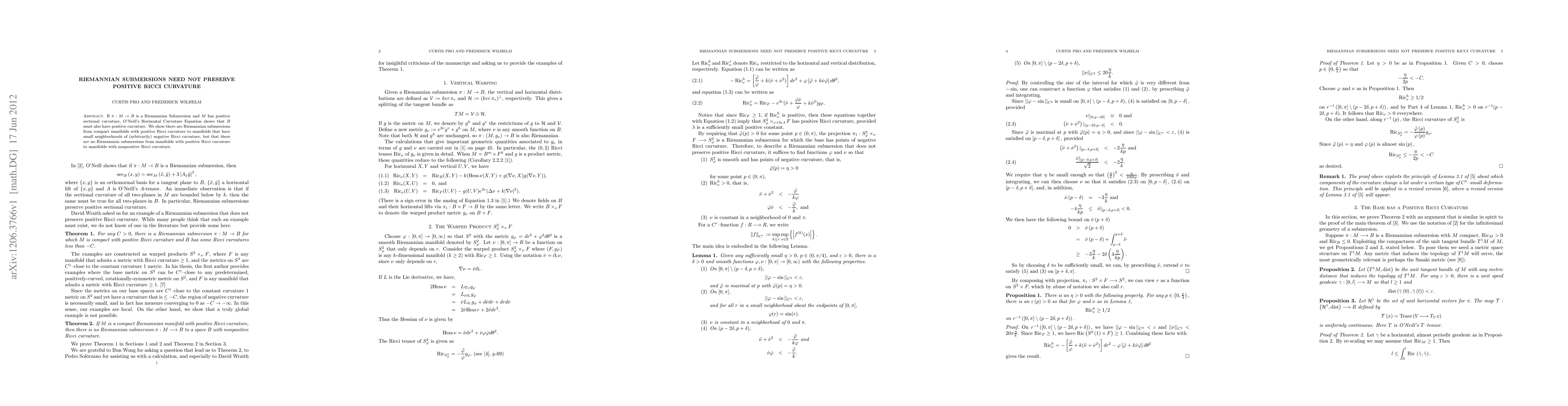 If $\pi :M\rightarrow B$ is a Riemannian Submersion and $M$ has positive sectional curvature, O'Neill's Horizontal Curvature Equation shows that $B$ must also have positive curvature. We show there are Riemannian submersions from compact manifolds with positive Ricci curvature to manifolds that have small neighborhoods of (arbitrarily) negative Ricci curvature, but that there are no Riemannian submersions from manifolds with positive Ricci curvature to manifolds with nonpositive Ricci curvature.