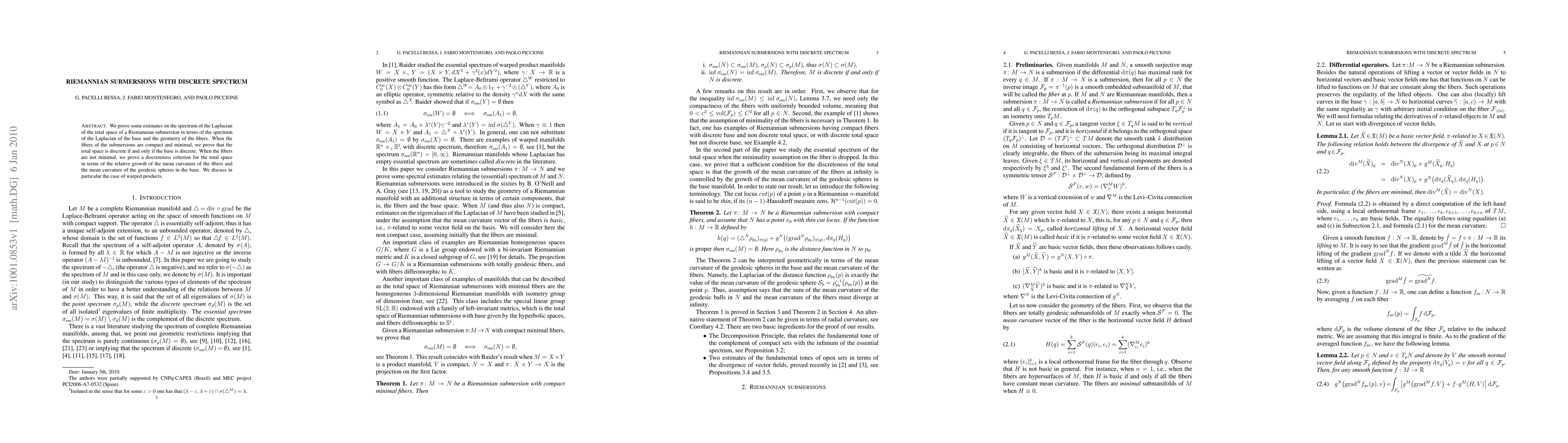 We prove some estimates on the spectrum of the Laplacian of the total space of a Riemannian submersion in terms of the spectrum of the Laplacian of the base and the geometry of the fibers. When the fibers of the submersions are compact and minimal, we prove that the total space is discrete if and only if the base is discrete. When the fibers are not minimal, we prove a discreteness criterion for the total space in terms of the relative growth of the mean curvature of the fibers and the mean curvature of the geodesic spheres in the base. We discuss in particular the case of warped products.