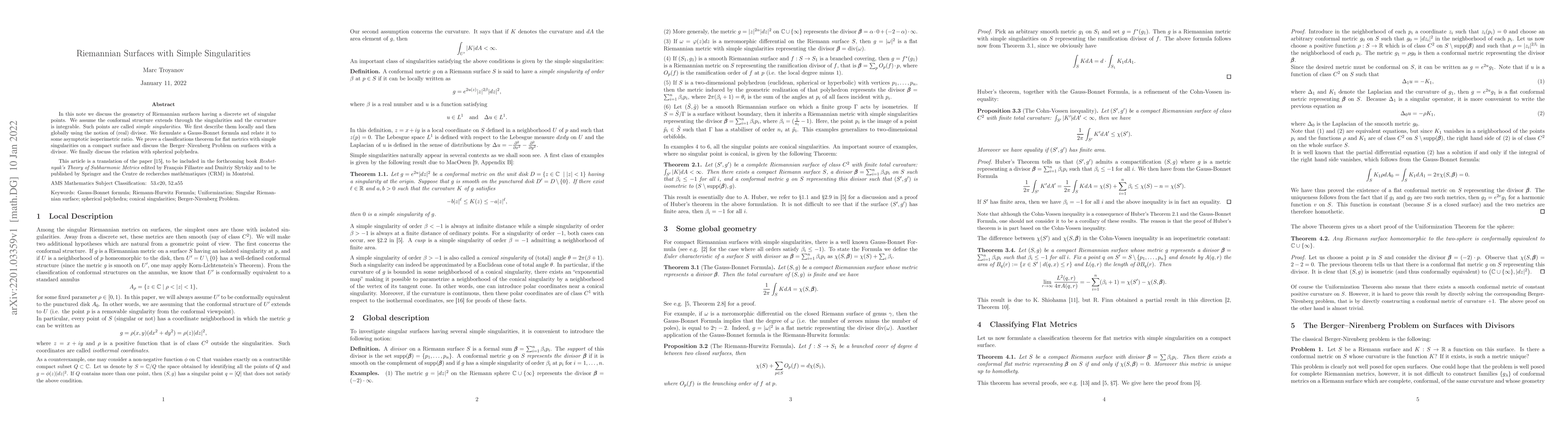 This paper explores the geometry of Riemannian surfaces with simple singularities, formulating a Gauss-Bonnet formula to classify flat metrics on compact surfaces and discussing implications for spherical polyhedra.