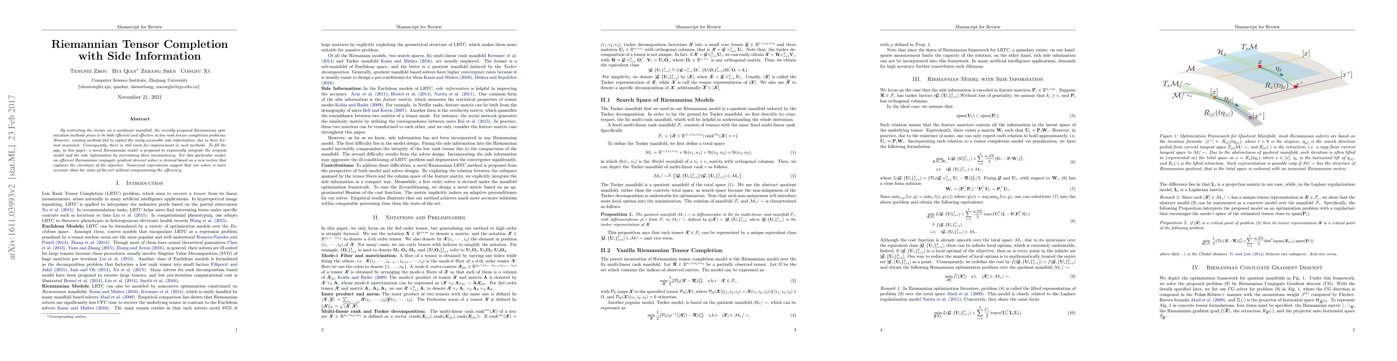 This paper proposes a novel Riemannian tensor completion model that integrates side information by overcoming format mismatches, enhancing existing methods. An efficient Riemannian conjugate gradient descent solver is developed, which outperforms state-of-the-art methods in accuracy without sacrificing efficiency.