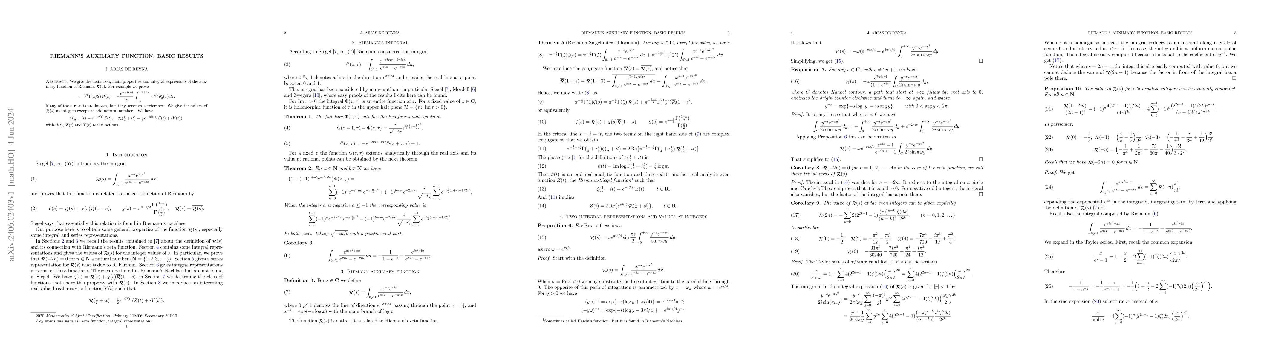 This paper defines Riemann's auxiliary function $\mathop{\mathcal R }(s)$, explores its properties and integral expressions, and proves a specific integral representation involving it. It also determines values for $\mathop{\mathcal R }(s)$ at integer points and connects it to the Riemann zeta function.
