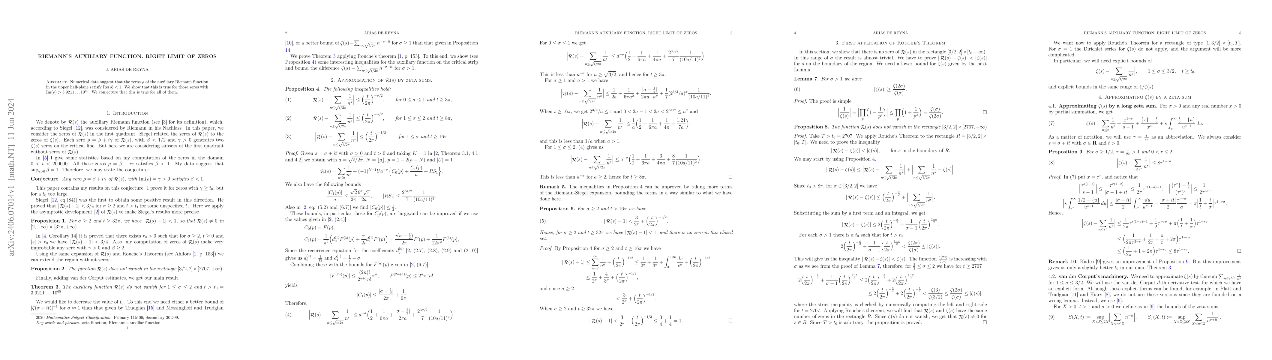 Summary: Research demonstrates that the zeros of Riemann's auxiliary function in the upper half-plane have real parts less than 1 for those with imaginary parts greater than $3.9211 \times 10^{65}$, with a conjecture extending this result to all zeros.