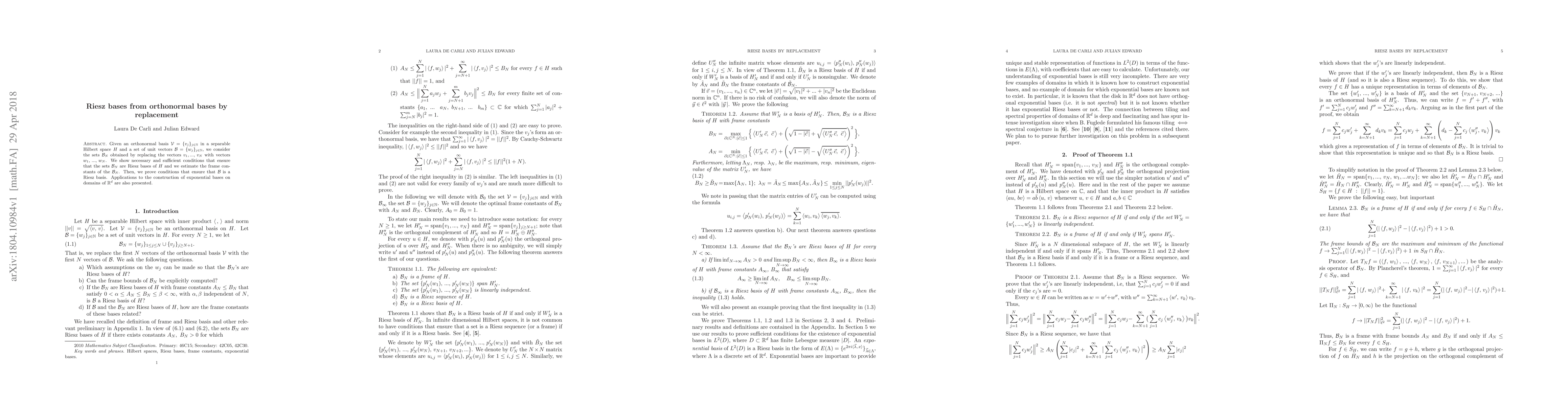 Given an orthonormal basis $ {\mathcal V}= \{v_j\} _{j\in N}$ in a separable Hilbert space $H$ and a set of unit vectors $ {\mathcal B}=\{w_j\}_{j\in N}$, we consider the sets $ {\mathcal B}_N$ obtained by replacing the vectors $v_1, ...,\, v_N$ with vectors $w_1,\, ...,\, w_N$. We show necessary and sufficient conditions that ensure that the sets $ {\mathcal B}_N$ are Riesz bases of $H$ and we estimate the frame constants of the $ {\mathcal B}_N$. Then, we prove conditions that ensure that $ {\mathcal B}$ is a Riesz basis. Applications to the construction of exponential bases on domains of $ R^d$ are also presented.