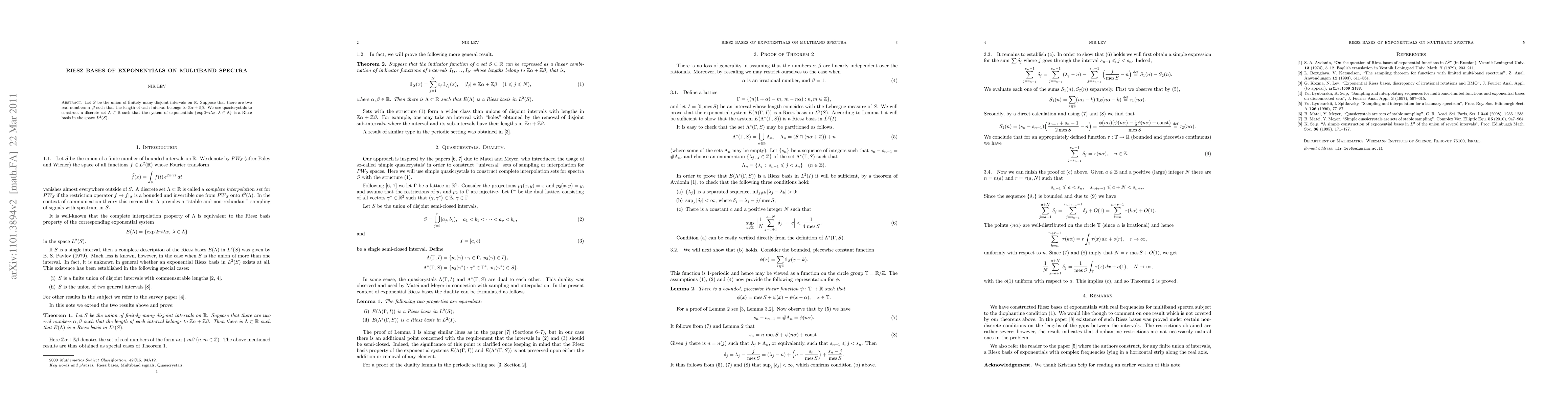 This paper constructs a discrete set of exponentials on multiband spectra using quasicrystals, demonstrating that the corresponding system forms a Riesz basis in the $L^2$ space over a union of intervals whose lengths are integer linear combinations of two given real numbers.