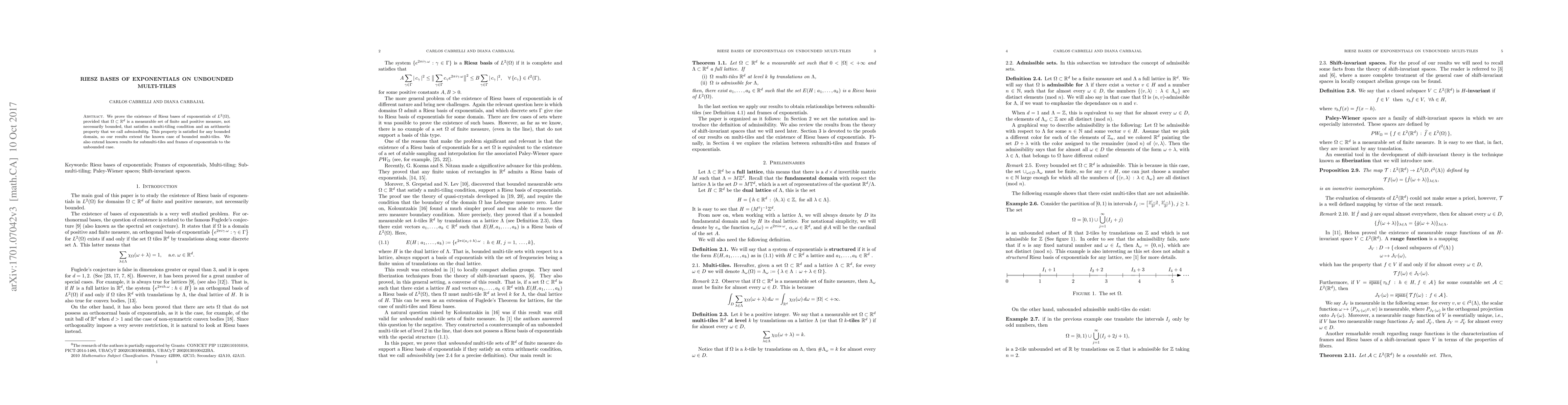 We prove the existence of Riesz bases of exponentials of L^2(Omega), provided that Omega in R^d is a measurable set of finite and positive measure, not necessarily bounded, that satisfies a multi-tiling condition and an arithmetic property that we call admissibility. This property is satisfied for any bounded domain, so our results extend the known case of bounded multi-tiles. We also extend known results for submulti-tiles and frames of exponentials to the unbounded case.