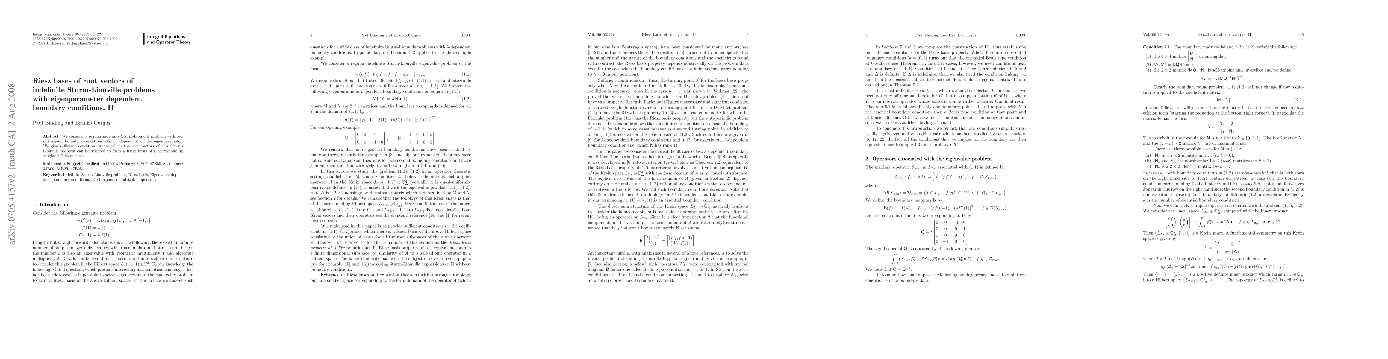 This paper investigates a regular indefinite Sturm-Liouville problem with boundary conditions that depend on the eigenparameter. It provides sufficient conditions for the root vectors to form a Riesz basis in a weighted Hilbert space.