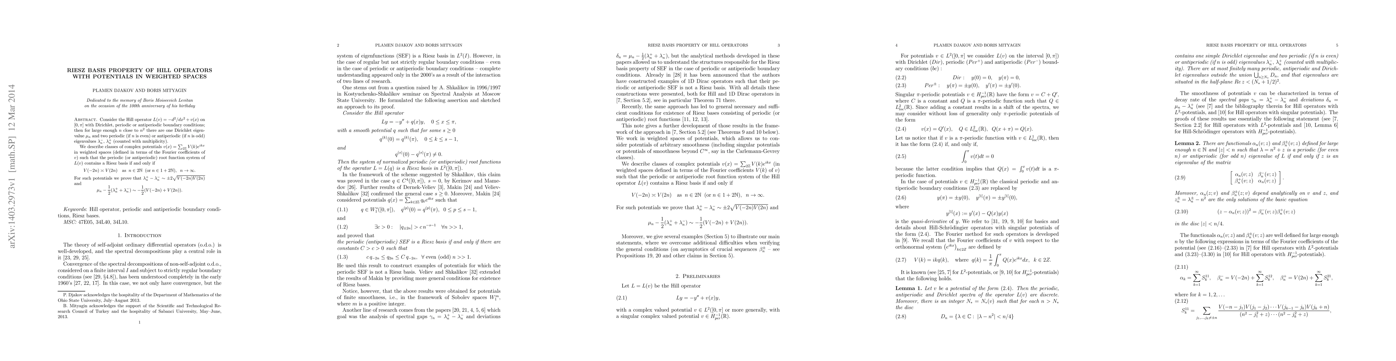 Consider the Hill operator $L(v) = - d^2/dx^2 + v(x) $ on $[0,\pi]$ with Dirichlet, periodic or antiperiodic boundary conditions; then for large enough $n$ close to $n^2 $ there are one Dirichlet eigenvalue $\mu_n$ and two periodic (if $n$ is even) or antiperiodic (if $n$ is odd) eigenvalues $\lambda_n^-, \, \lambda_n^+ $ (counted with multiplicity). We describe classes of complex potentials $v(x)= \sum_{2\mathbb{Z}} V(k) e^{ikx}$ in weighted spaces (defined in terms of the Fourier coefficients of $v$) such that the periodic (or antiperiodic) root function system of $L(v) $ contains a Riesz basis if and only if $$V(-2n) \asymp V(2n) \quad \text{as} \;\; n \in 2\mathbb{N}\;\; (\text{or} \; n \in 1+ 2\mathbb{N}), \;\; n \to \infty.$$ For such potentials we prove that $\lambda_n^+ - \lambda_n^- \sim \pm 2\sqrt{V(-2n)V(2n)} $ and $$\mu_n - \frac{1}{2}(\lambda_n^+ + \lambda_n^-) \sim -\frac{1}{2} (V(-2n) + V(2n)).$$