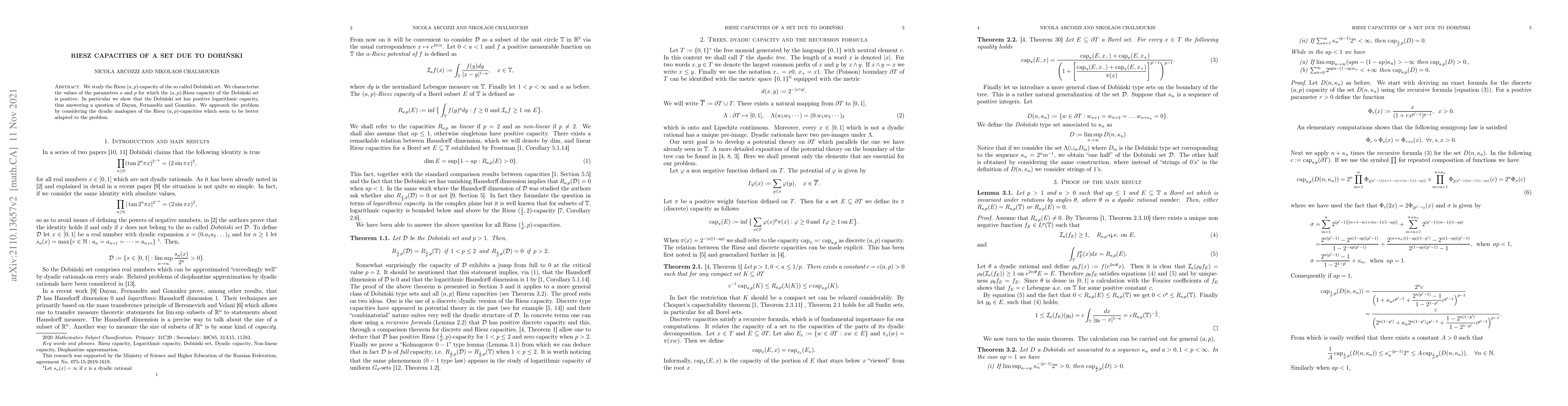 We study the Riesz $(a,p)$-capacity of the so called Dobi\'nski set. We characterize the values of the parameters $a$ and $p$ for which the $(a,p)$-Riesz capacity of the Dobi\'nski set is positive. In particular we show that the Dobi\'nski set has positive logarithmic capacity, thus answering a question of Dayan, Fernand\'ez and Gonz\'alez. We approach the problem by considering the dyadic analogues of the Riesz $(a,p)$-capacities which seem to be better adapted to the problem.