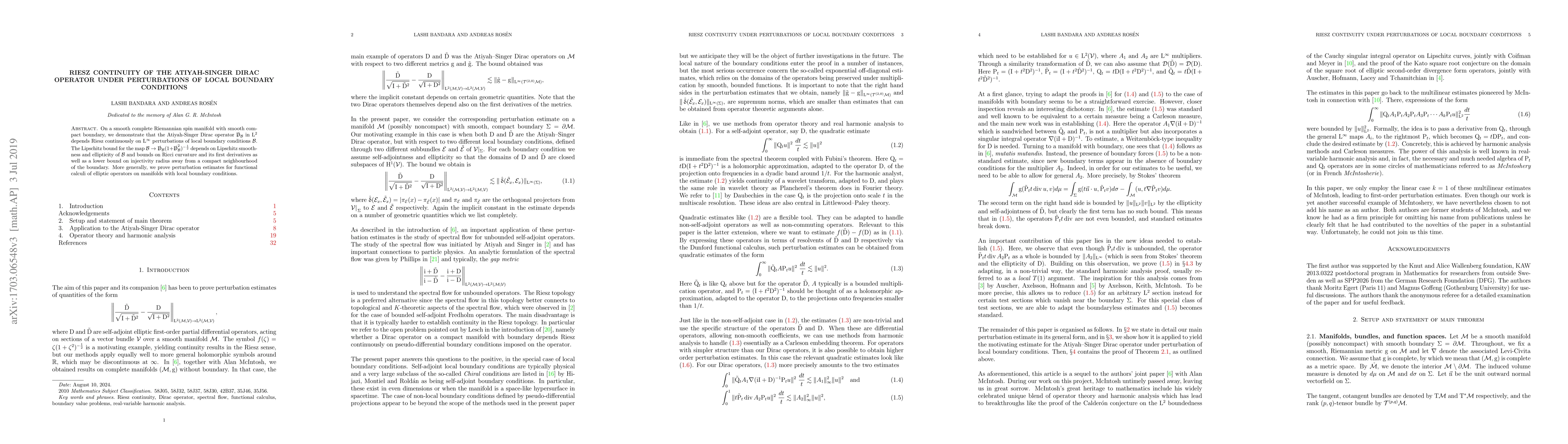 On a smooth complete Riemannian spin manifold with smooth compact boundary, we demonstrate that the Atiyah-Singer Dirac operator $\mathrm{D}_{\mathcal B}$ in $\mathrm{L}^{2}$ depends Riesz continuously on $\mathrm{L}^{\infty}$ perturbations of local boundary conditions ${\mathcal B}$. The Lipschitz bound for the map ${\mathcal B} \to {\mathrm{D}}_{\mathcal B}(1 + {\mathrm{D}}_{\mathcal B}^2)^{-\frac{1}{2}}$ depends on Lipschitz smoothness and ellipticity of ${\mathcal B}$ and bounds on Ricci curvature and its first derivatives as well as a lower bound on injectivity radius. More generally, we prove perturbation estimates for functional calculi of elliptic operators on manifolds with local boundary conditions.