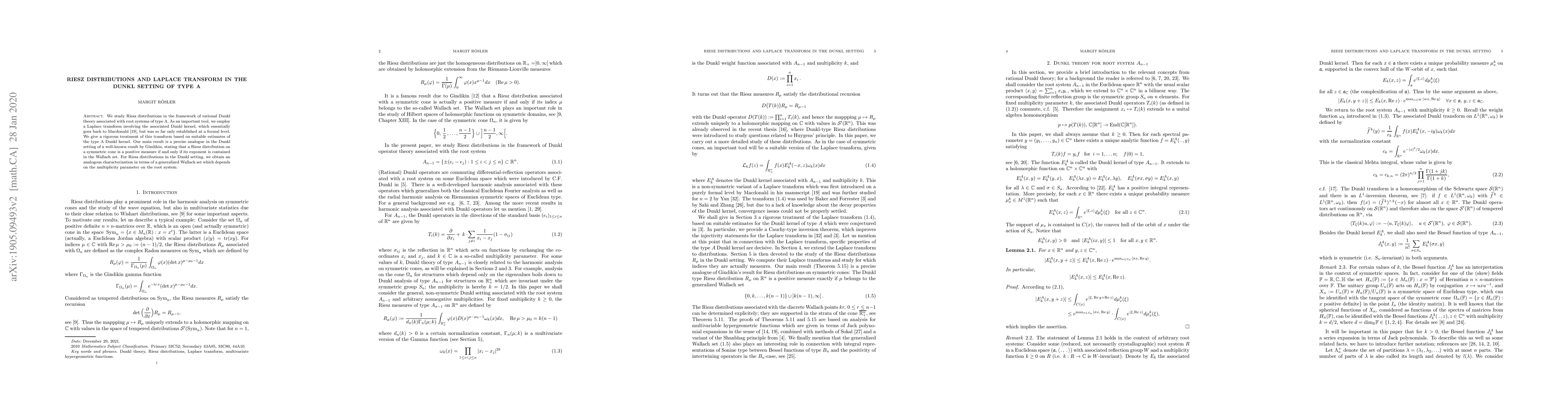 This paper rigorously establishes a Laplace transform in the Dunkl setting for type A root systems, providing a precise analogue of Gindikin's theorem on Riesz distributions. The authors characterize Riesz distributions in terms of a generalized Wallach set dependent on the multiplicity parameter.