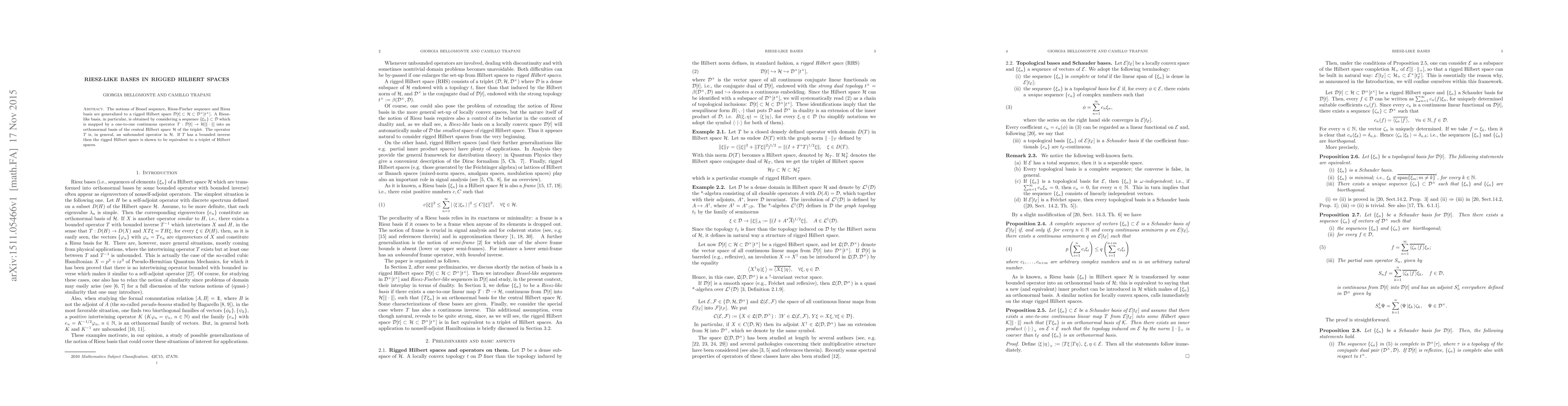 The paper introduces and rigorously defines Riesz-like bases in the context of rigged Hilbert spaces, generalizing classical notions from standard Hilbert spaces to accommodate unbounded operators and more complex topological structures.