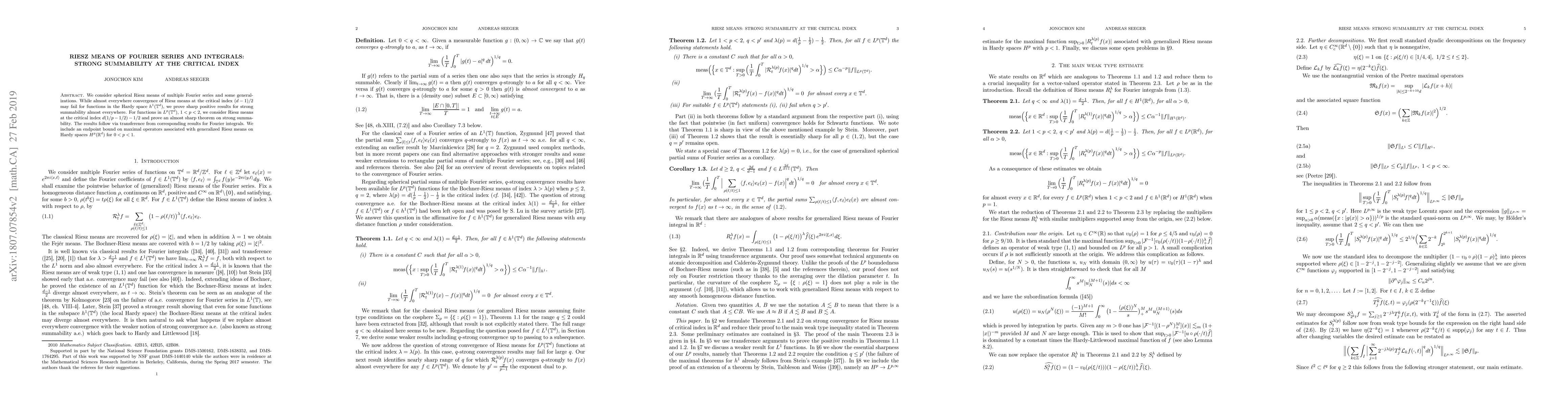 This paper investigates the strong summability of spherical Riesz means for multiple Fourier series and integrals at critical indices, proving almost everywhere strong summability for specific function spaces and deriving endpoint bounds for maximal operators associated with generalized Riesz means on Hardy spaces.