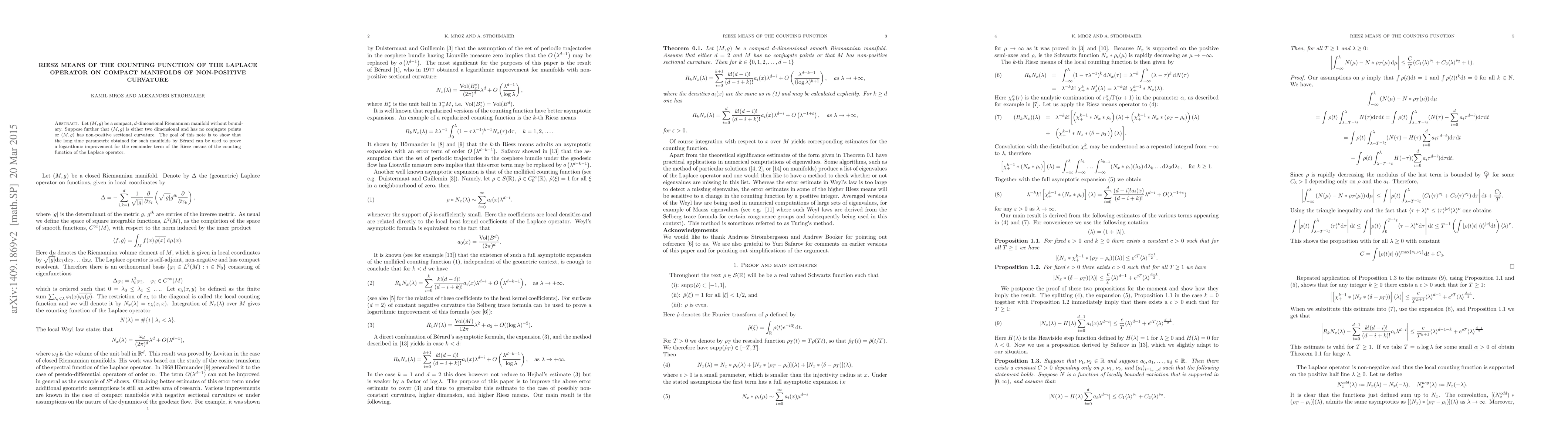 Let $(M, {g})$ be a compact, $d$-dimensional Riemannian manifold without boundary. Suppose further that $(M,g)$ is either two dimensional and has no conjugate points or $(M,g)$ has non-positive sectional curvature. The goal of this note is to show that the long time parametrix obtained for such manifolds by B\'erard can be used to prove a logarithmic improvement for the remainder term of the Riesz means of the counting function of the Laplace operator.