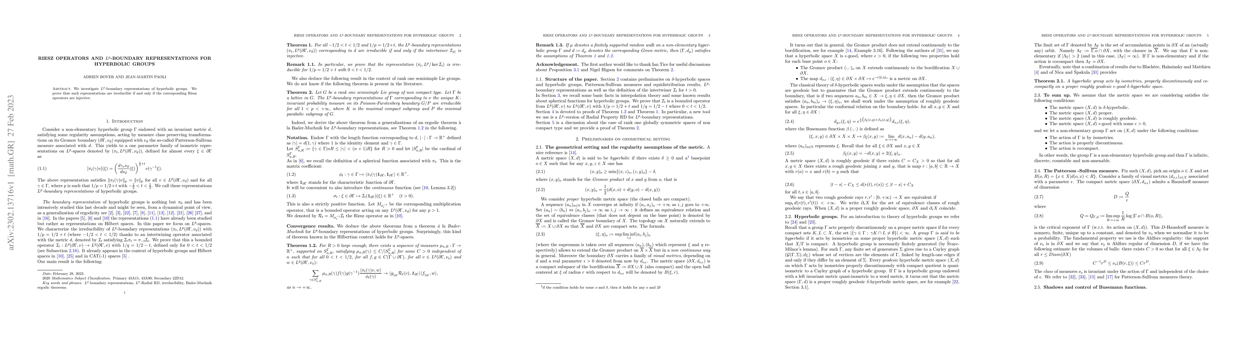 This paper examines Lp-boundary representations of hyperbolic groups, proving that these representations are irreducible if and only if the associated Riesz operators are injective. The study highlights the connection between injectivity of Riesz operators and the irreducibility of Lp-boundary representations.