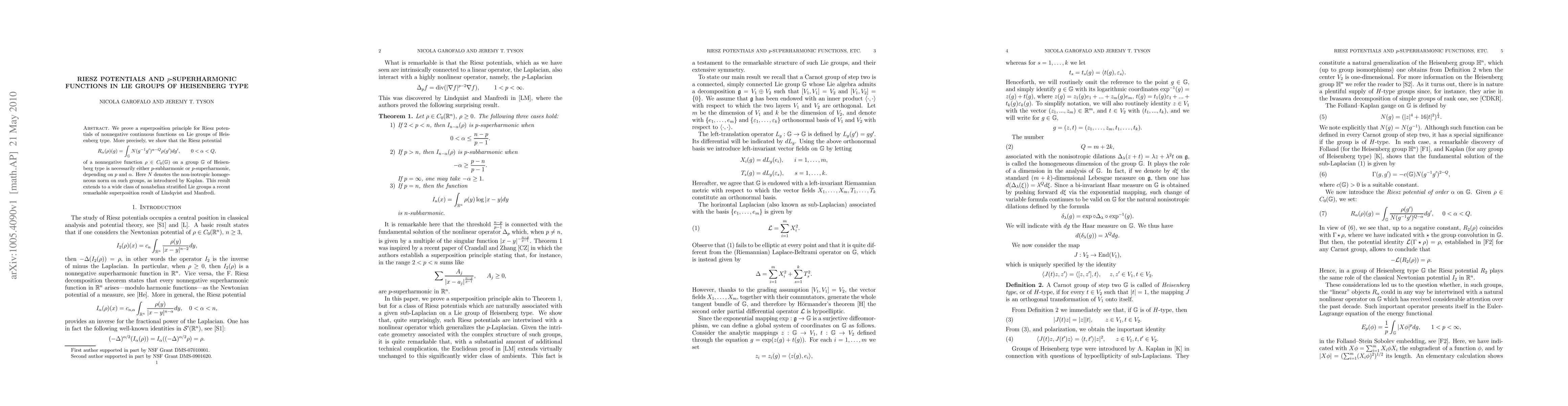 Researchers prove a superposition principle for Riesz potentials on Heisenberg-type Lie groups, showing they are either p-subharmonic or p-superharmonic, depending on parameters alpha and Q.