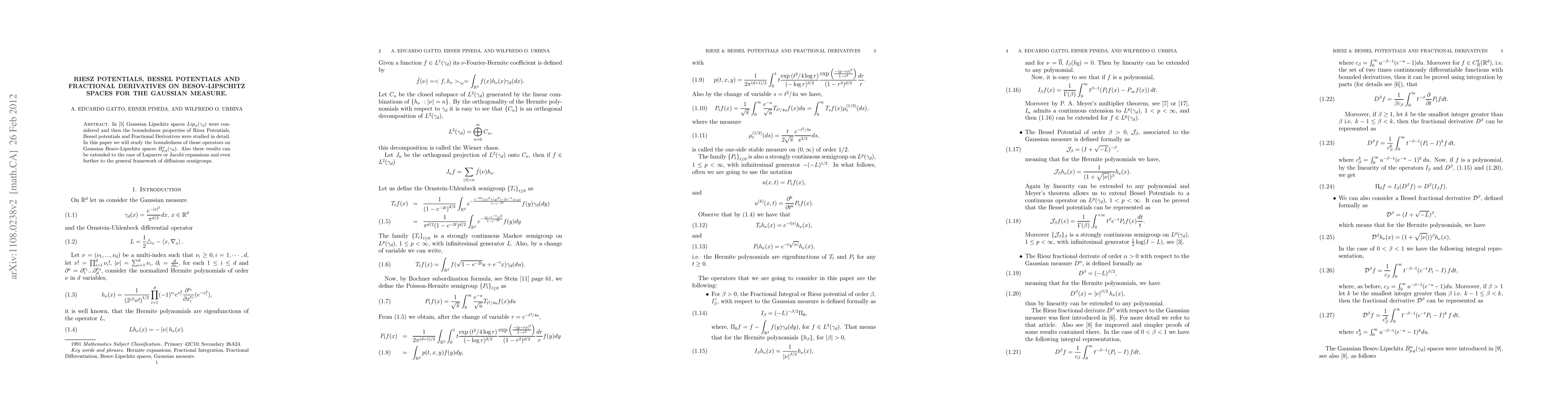 In this paper we will study the boundedness of Riesz Potentials, Bessel potentials and Fractional Derivatives on Gaussian Besov-Lipschitz spaces $B_{p,q}^{\alpha}(\gamma_d)$. Also these results can be extended to the case of Laguerre or Jacobi expansions and even further to the general framework of diffusions semigroups.