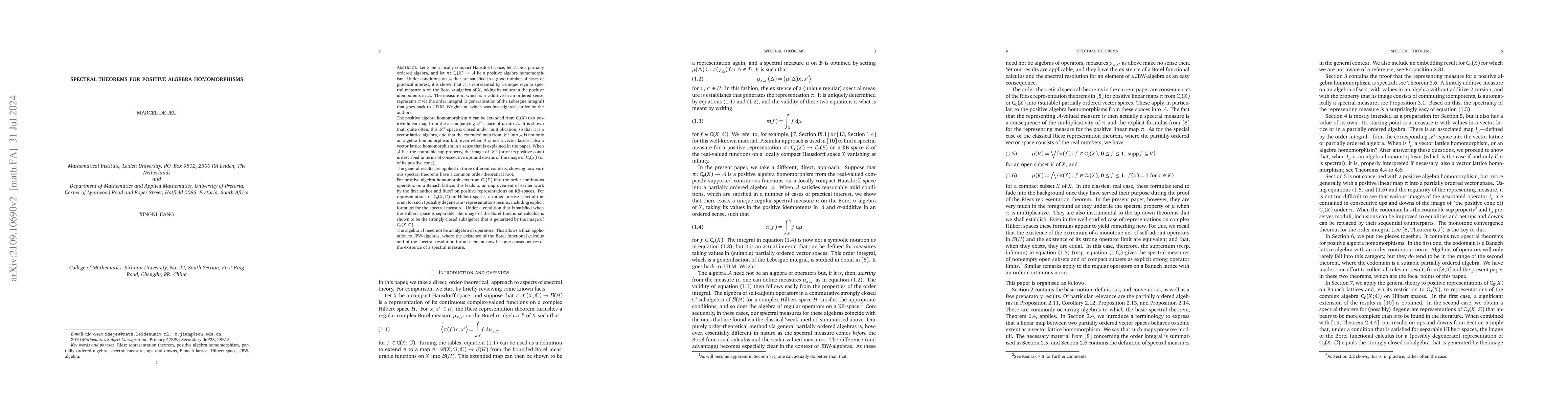Let $X$ be a locally compact Hausdorff space, let $\mathrm A$ be a partially ordered algebra, and let $T:\mathrm{C}_{\mathrm c}(X)\to \mathrm A$ be a positive algebra homomorphism. Under conditions on $\mathrm A$ that are satisfied in a good number of cases of practical interest, we show that $T$ is represented by a (unique regular) measure $\mu$ on the Borel $\sigma$-algebra of $X$ that takes it values in the positive cone of $\mathrm A$, and with the property that $\mu(A_1\cap A_2)=\mu(A_1)\mu(A_2)$ for Borel subsets $A_1,A_2$ of $X$. The positive algebra homomorphism $T$ can be extended from ${\mathrm C}_{\mathrm c}(X)$ to the accompanying $\mathcal L^1$-space of $\mu$. We show that, quite often, this $\mathcal L^1$-space is closed under multiplication, so that it is a Riesz algebra, and that the extended map $T:\mathcal L^1\to\mathrm A$ is not only an algebra homomorphism, but, even when $\mathrm A$ is not a Riesz space, also a vector lattice homomorphism in a sense that is explained in the paper. The latter property enables one to describe images of the extended map in terms of sequential up-downs and down-ups of the image of (the positive cone of ) ${\mathrm C}_{\mathrm c}(X)$ when $\mathrm A$ has the countable sup property. We apply the main results, which are obtained by purely order-theoretical methods, to positive algebra homomorphisms from ${\mathrm C}_0(X)$ into the order continuous operators on a Banach lattice, and to representations of ${\mathrm C}_0(X,\mathbb C)$ on Hilbert spaces. It is thus seen that, for representations on Banach lattices and on Hilbert spaces, although situated in rather different contexts, spectral theorems can be established that are both rooted in the same order-theoretical Riesz representation theorem for positive algebra homomorphisms from ${\mathrm C_\mathrm c}(X)$ into partially ordered algebras.