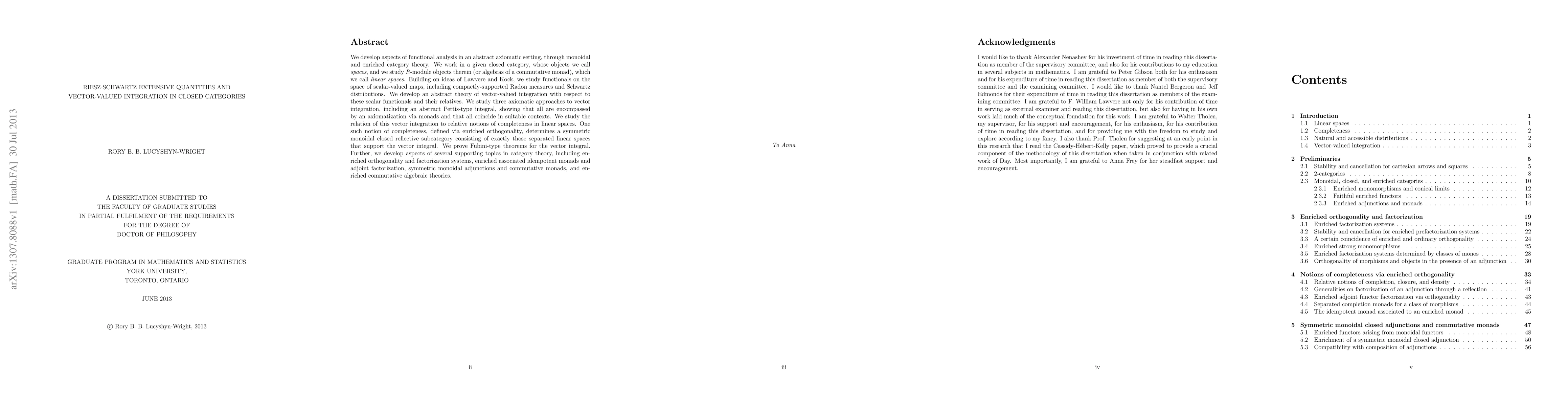 We develop aspects of functional analysis in an abstract axiomatic setting, through monoidal and enriched category theory. We work in a given closed category, whose objects we call spaces, and we study R-module objects therein (or algebras of a commutative monad), which we call linear spaces. Building on ideas of Lawvere and Kock, we study functionals on the space of scalar-valued maps, including compactly-supported Radon measures and Schwartz distributions. We develop an abstract theory of vector-valued integration with respect to these scalar functionals and their relatives. We study three axiomatic approaches to vector integration, including an abstract Pettis-type integral, showing that all are encompassed by an axiomatization via monads and that all coincide in suitable contexts. We study the relation of this vector integration to relative notions of completeness in linear spaces. One such notion of completeness, defined via enriched orthogonality, determines a symmetric monoidal closed reflective subcategory consisting of exactly those separated linear spaces that support the vector integral. We prove Fubini-type theorems for the vector integral. Further, we develop aspects of several supporting topics in category theory, including enriched orthogonality and factorization systems, enriched associated idempotent monads and adjoint factorization, symmetric monoidal adjunctions and commutative monads, and enriched commutative algebraic theories.