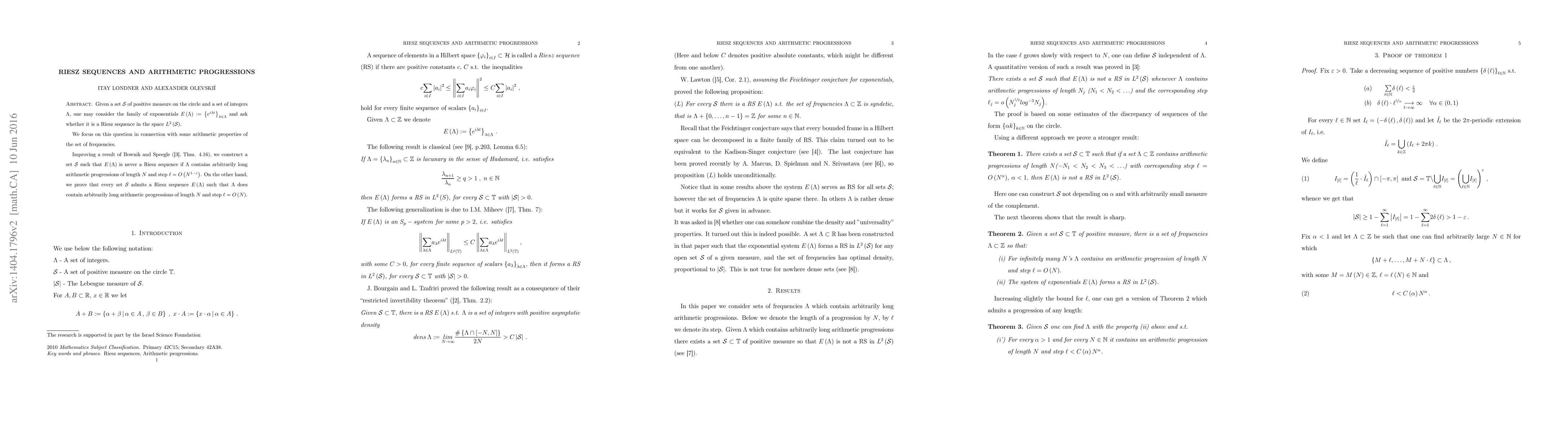 Given a set $\mathcal{S}$ of positive measure on the circle and a set of integers $\Lambda$, one may consider the family of exponentials $E\left(\Lambda\right):=\left\{ e^{i\lambda t}\right\}_{\lambda\in\Lambda}$ and ask whether it is a Riesz sequence in the space $L^{2}\left(\mathcal{S}\right)$. We focus on this question in connection with some arithmetic properties of the set of frequencies. Improving a result of Bownik and Speegle, we construct a set $\mathcal{S}$ such that $E\left(\Lambda\right)$ is never a Riesz sequence if $\Lambda$ contains arbitrary long arithmetic progressions of length $N$ and step $\ell=O\left(N^{1-\varepsilon}\right)$. On the other hand, we prove that every set $\mathcal{S}$ admits a Riesz sequence $E\left(\Lambda\right)$ such that $\Lambda$ does contain arbitrary long arithmetic progressions of length $N$ and step $\ell=O\left(N\right)$.