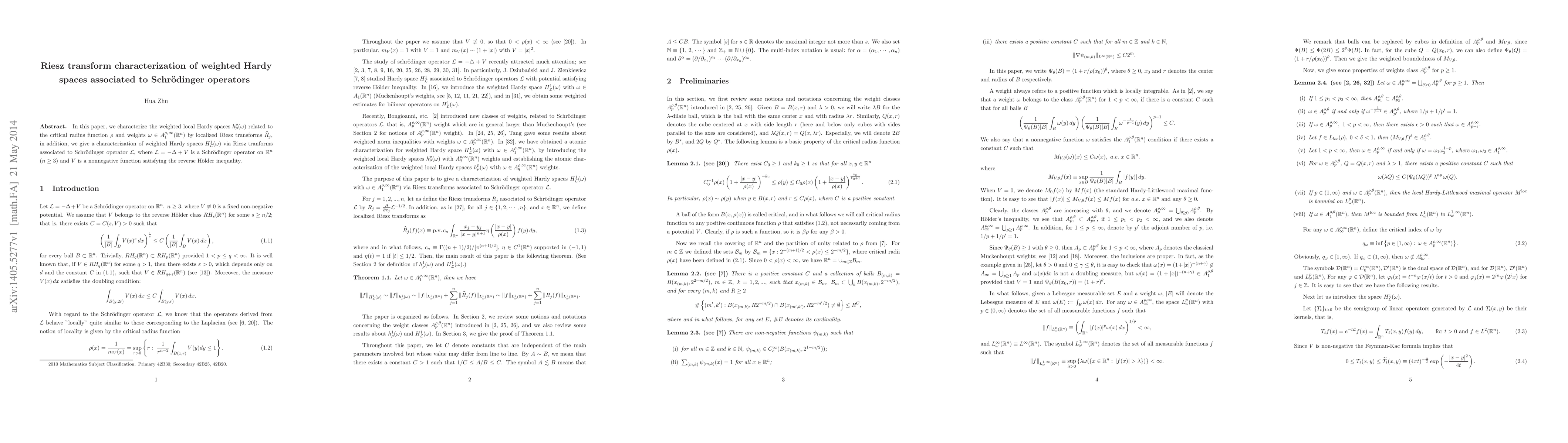In this paper, we characterize the weighted local Hardy spaces $h^p_\rho(\omega)$ related to the critical radius function $\rho$ and weights $\omega\in A_{1}^{\rho,\,\infty}(\mathbb{R}^{n})$ by localized Riesz transforms $\widehat{R}_j$, in addition, we give a characterization of weighted Hardy spaces $H^{1}_{\cal L}(\omega)$ via Riesz tranforms associated to Schr\"{o}dinger operator $\cal L$, where $\L=-\Delta+V$ is a Schr\"{o}dinger operator on $\mathbb{R}^{n}$ ($n\ge 3$) and $V$ is a nonnegative function satisfying the reverse H\"older inequality.