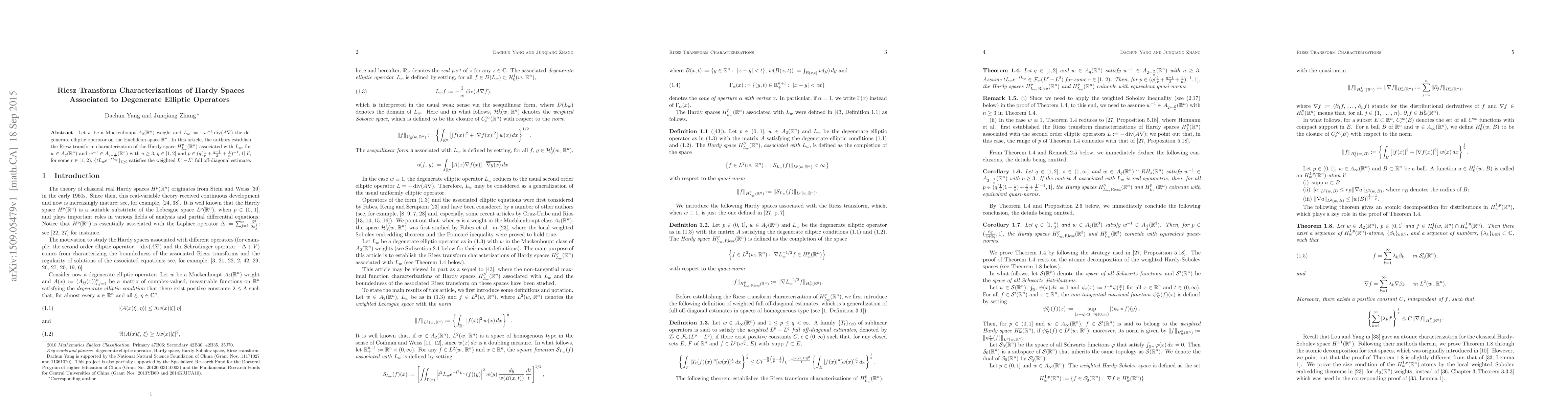 This paper establishes Riesz transform characterizations for Hardy spaces $H_{L_w}^p(\mathbb{R}^n)$ associated with degenerate elliptic operators $L_w$, under specific conditions on the Muckenhoupt $A_2$ weight $w$. The results rely on the weighted $L^r-L^2$ full off-diagonal estimate for $\{tL_w e^{-tL_w}\}_{t\geq 0}$.