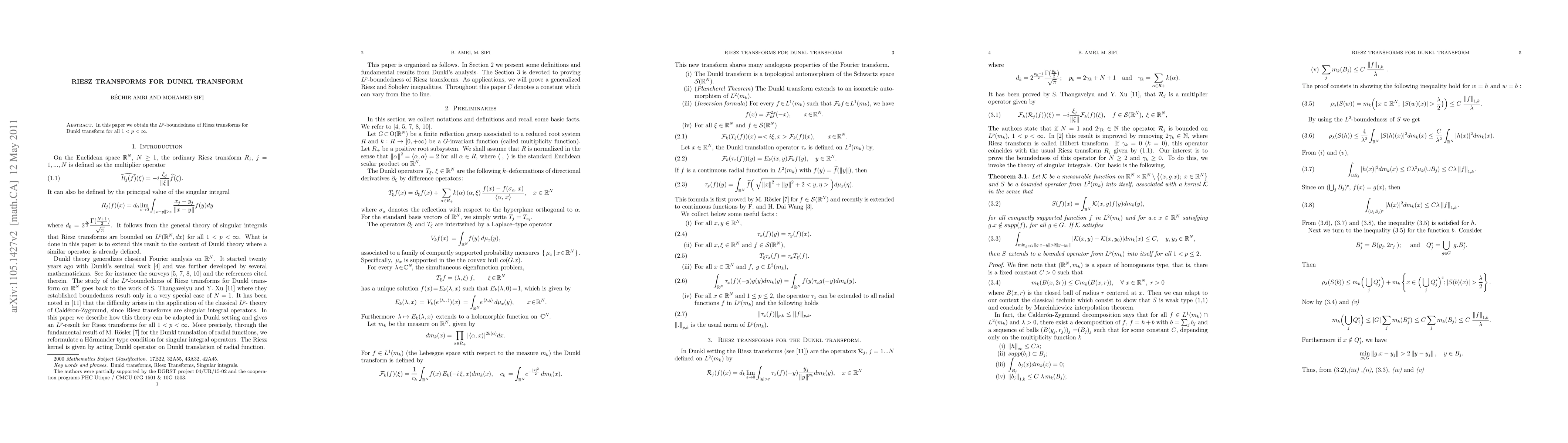Summary: This paper investigates the $L^p$-boundedness of Riesz transforms associated with the Dunkl transform for all $1 < p < \infty$, establishing their boundedness properties.