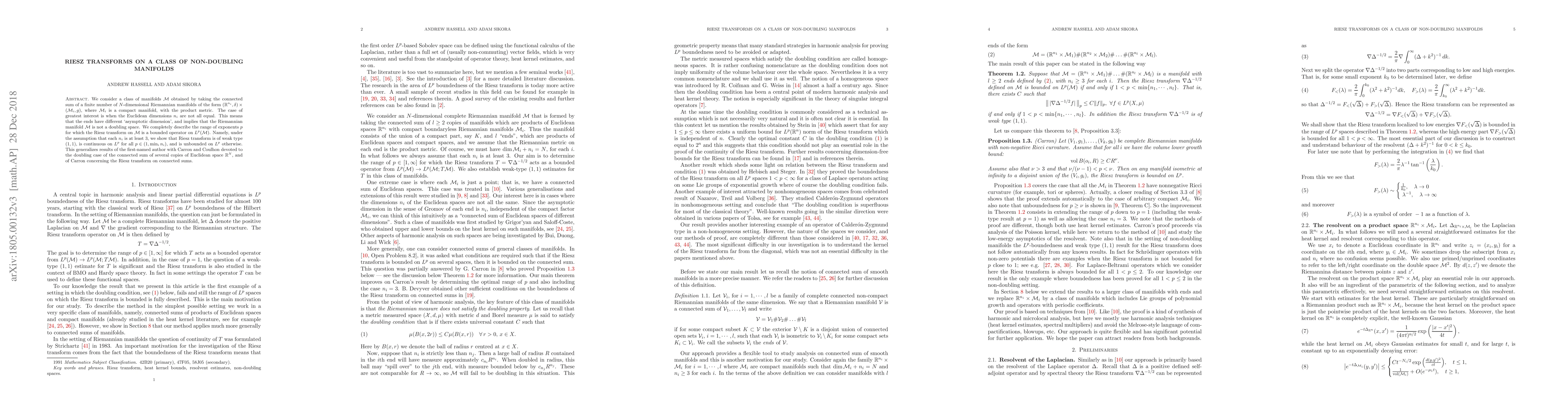 We consider a class of manifolds $\mathcal{M}$ obtained by taking the connected sum of a finite number of $N$-dimensional Riemannian manifolds of the form $(\mathbb{R}^{n_i}, \delta) \times (\mathcal{M}_i, g)$, where $\mathcal{M}_i$ is a compact manifold, with the product metric. The case of greatest interest is when the Euclidean dimensions $n_i$ are not all equal. This means that the ends have different `asymptotic dimension', and implies that the Riemannian manifold $\mathcal{M}$ is not a doubling space. We completely describe the range of exponents $p$ for which the Riesz transform on $\mathcal{M}$ is a bounded operator on $L^p(\mathcal{M})$. Namely, under the assumption that each $n_i$ is at least $3$, we show that Riesz transform is of weak type $(1,1)$, is continuous on $L^p$ for all $p \in (1, \min_i n_i)$, and is unbounded on $L^p$ otherwise. This generalizes results of the first-named author with Carron and Coulhon devoted to the doubling case of the connected sum of several copies of Euclidean space $\mathbb{R}^{N}$, and of Carron concerning the Riesz transform on connected sums.