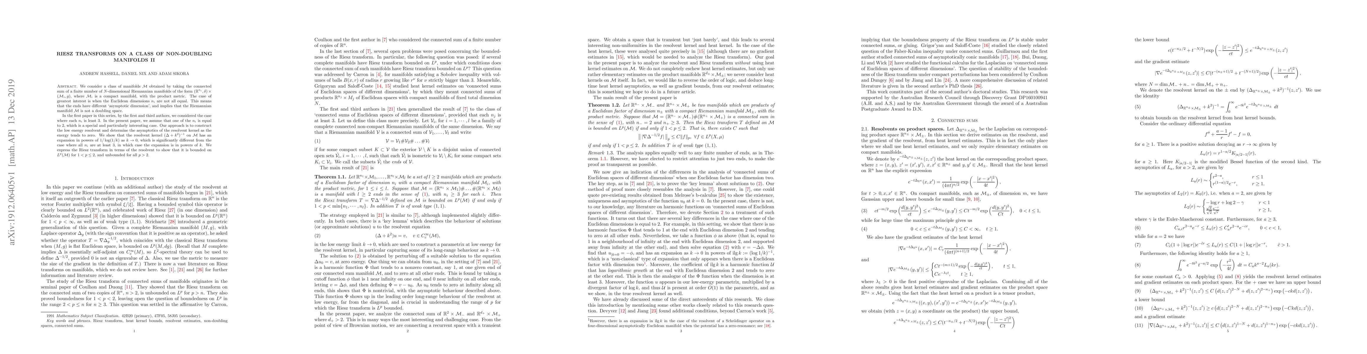 This paper explores Riesz transforms on non-doubling manifolds, constructed by connecting several Riemannian manifolds with varying Euclidean dimensions. Focusing on a case where one Euclidean dimension is 2, the authors determine the asymptotics of the resolvent kernel near zero energy, leading to a logarithmic expansion. They express the Riesz transform in terms of the resolvent, proving its boundedness on $L^p(mathcal{M})$ for $1 < p leq 2$, and unboundedness for all $p > 2$.