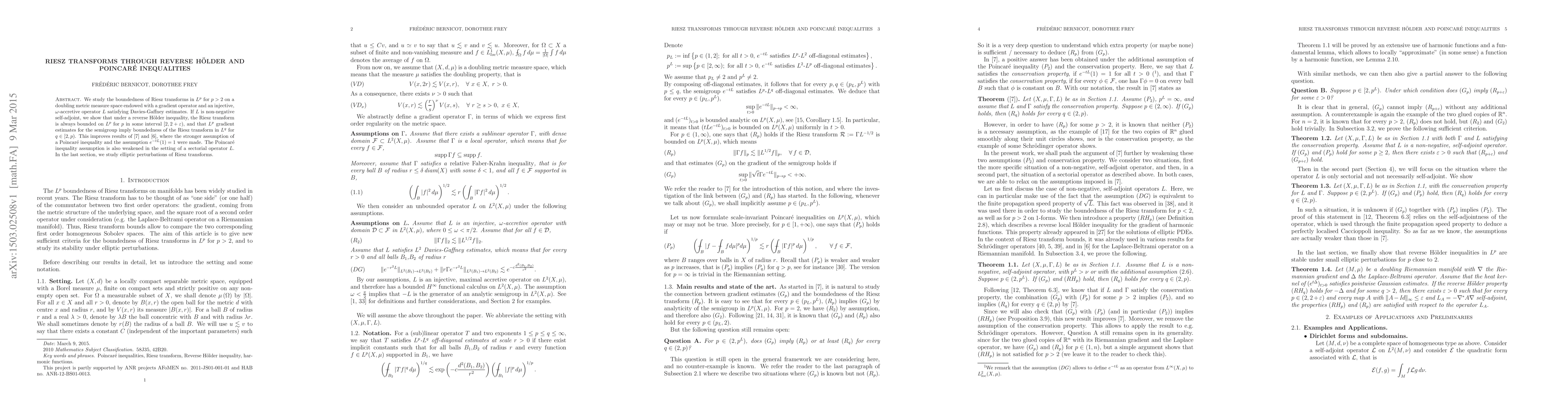 We study the boundedness of Riesz transforms in $L^p$ for $p>2$ on a doubling metric measure space endowed with a gradient operator and an injective, $\omega$-accretive operator $L$ satisfying Davies-Gaffney estimates. If $L$ is non-negative self-adjoint, we show that under a reverse H\"older inequality, the Riesz transform is always bounded on $L^p$ for $p$ in some interval $[2,2+\varepsilon)$, and that $L^p$ gradient estimates for the semigroup imply boundedness of the Riesz transform in $L^q$ for $q \in [2,p)$. This improves results of \cite{ACDH} and \cite{AC}, where the stronger assumption of a Poincar\'e inequality and the assumption $e^{-tL}(1)=1$ were made. The Poincar\'e inequality assumption is also weakened in the setting of a sectorial operator $L$. In the last section, we study elliptic perturbations of Riesz transforms.