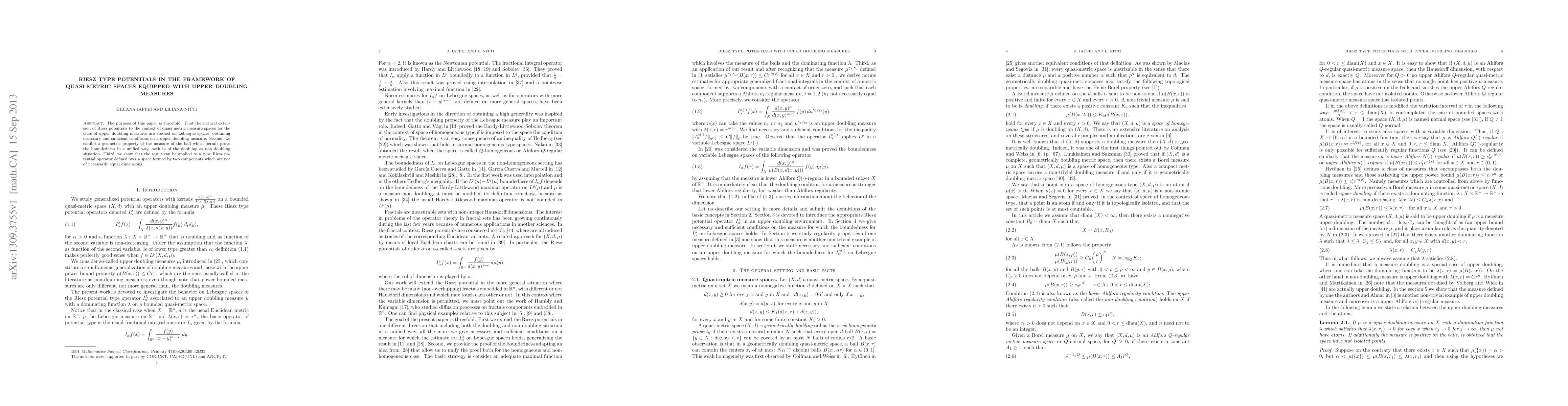 The purpose of this paper is threefold. First the natural extension of Riesz potentials to the context of quasi metric measure spaces for the class of upper doubling measures are studied on Lebesgue spaces, obtaining necessary and sufficient conditions on a upper doubling measure. Second, we exhibit a geometric property of the measure of the ball which permit prove the boundedness in a unified way, both in of the doubling as non doubling situation. Third, we show that the result can be applied to a type Riesz potential operator defined over a space formed by two components which are not of necessarily equal dimensions.