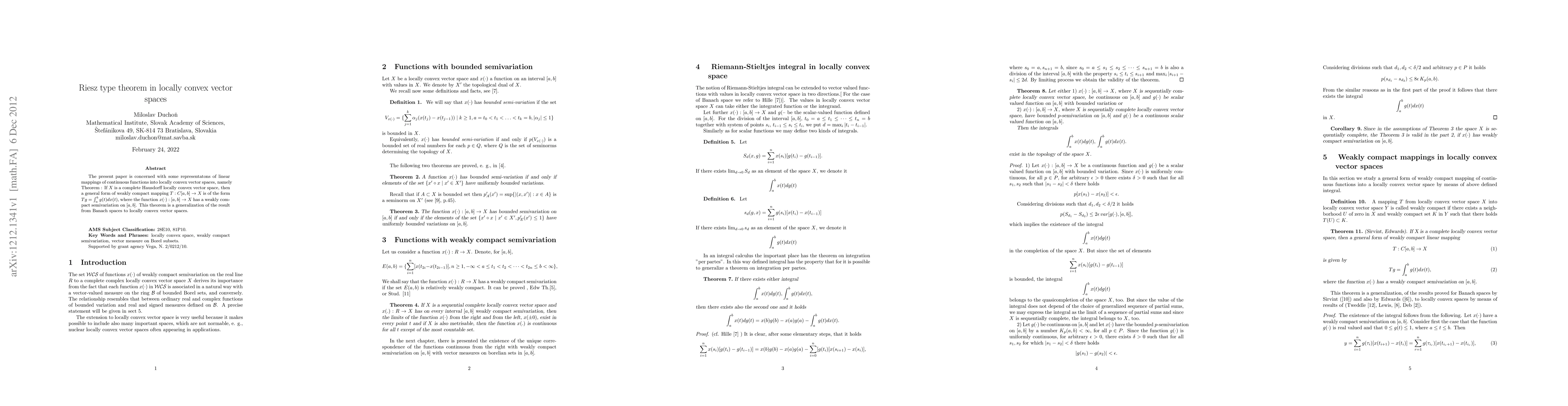 This paper extends the Riesz type theorem to locally convex vector spaces, proving that any weakly compact mapping from continuous functions on a closed interval into such spaces can be represented as an integral with a weakly compact semivariation. This generalizes the classical result from Banach spaces.